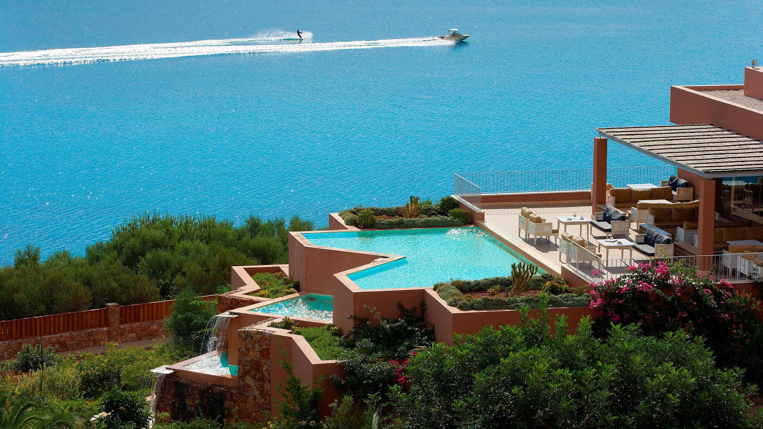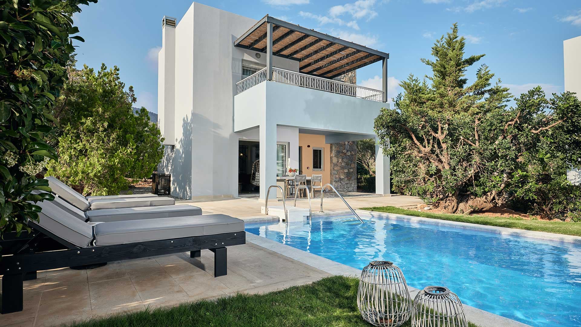 Двухуровневая вилла. Частный сад, открытый персональный бассейн (35 кв. м), гостиная с обеденной и кухонной зоной, 2 спальни (одна – с кроватью king-size, другая – с двумя отдельными кроватями), 2 ванные комнаты, гостевой туалет. Вид на залив и территорию курорта. Гости данных номеров имеют особые привилегии. - 250 кв.м.
