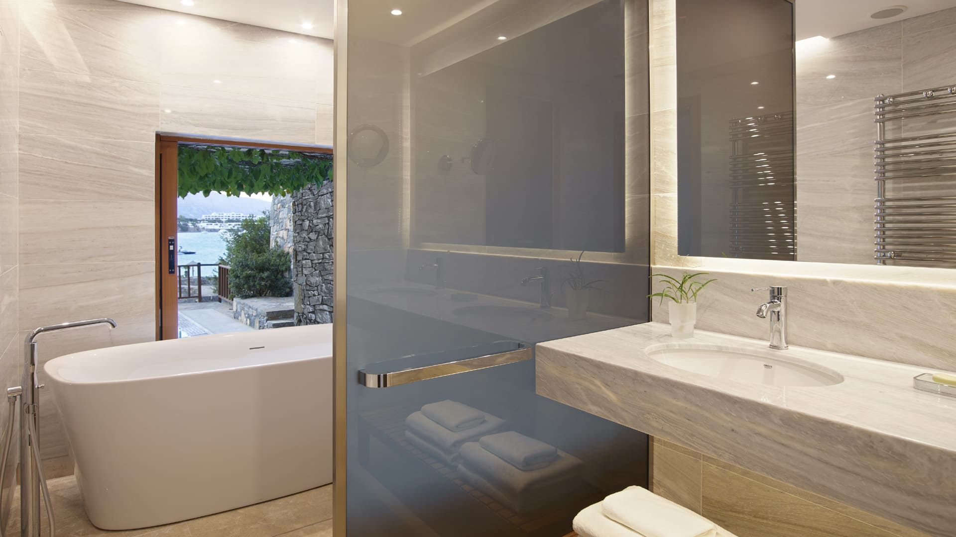 2 ресторана, 2 бара, винный погреб, закрытый подогреваемый бассейн с пресной водой, хамам, сауна, тренажерный зал, кинотеатр, парковка, причал для яхт. Гости могут пользоваться инфраструктурой и услугами соседнего отеля Porto Elounda Golf & Spa Resort (отели расположены в одной бухте и находятся рядом).
