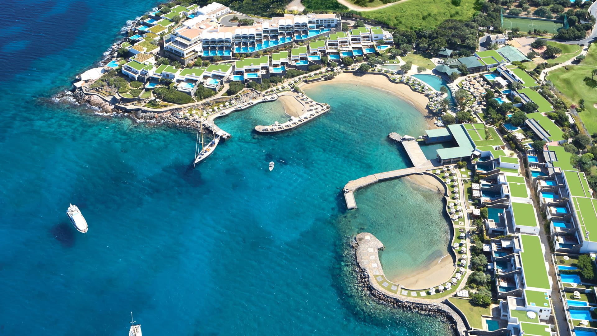 Отель расположен на берегу залива Мирабелло в престижной курортной зоне Элунда на северо-восточном побережье Крита в 70 км от аэропорта Ираклиона.