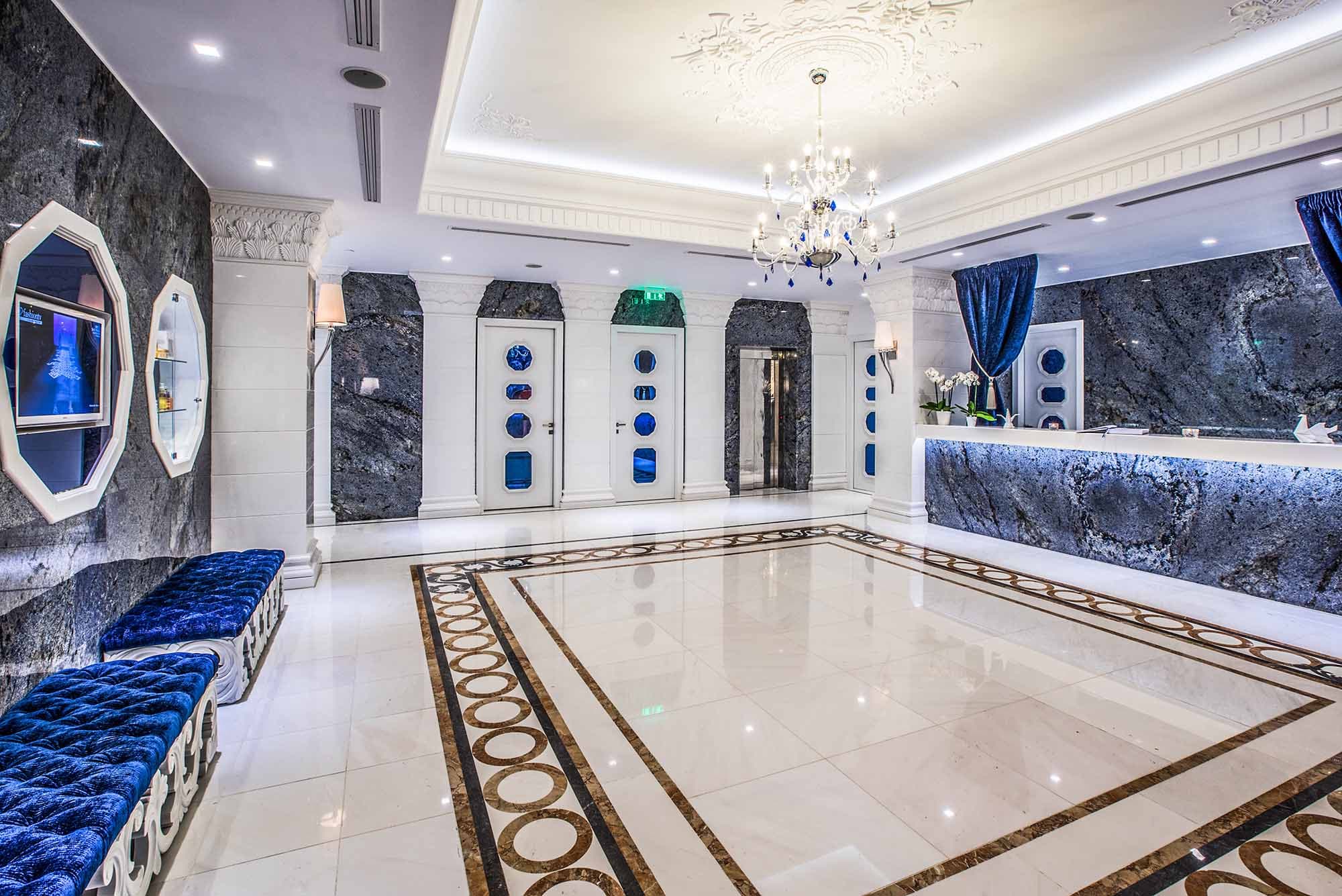 172 номера, 3 ресторана, 5 баров, ночной клуб, пляж, открытый бассейн с пресной водой, детский бассейн с пресной водой, SPA-центр (закрытый бассейн с морской водой, джакузи, хамам, парная, финская сауна, русская баня, египетская баня, соляная комната, ледяной фонтан, массаж, ароматерапия, процедуры по методу Кнайппа, процедуры для лица и тела), салон красоты, тренажерный зал. Услуги консьержа, парковка.