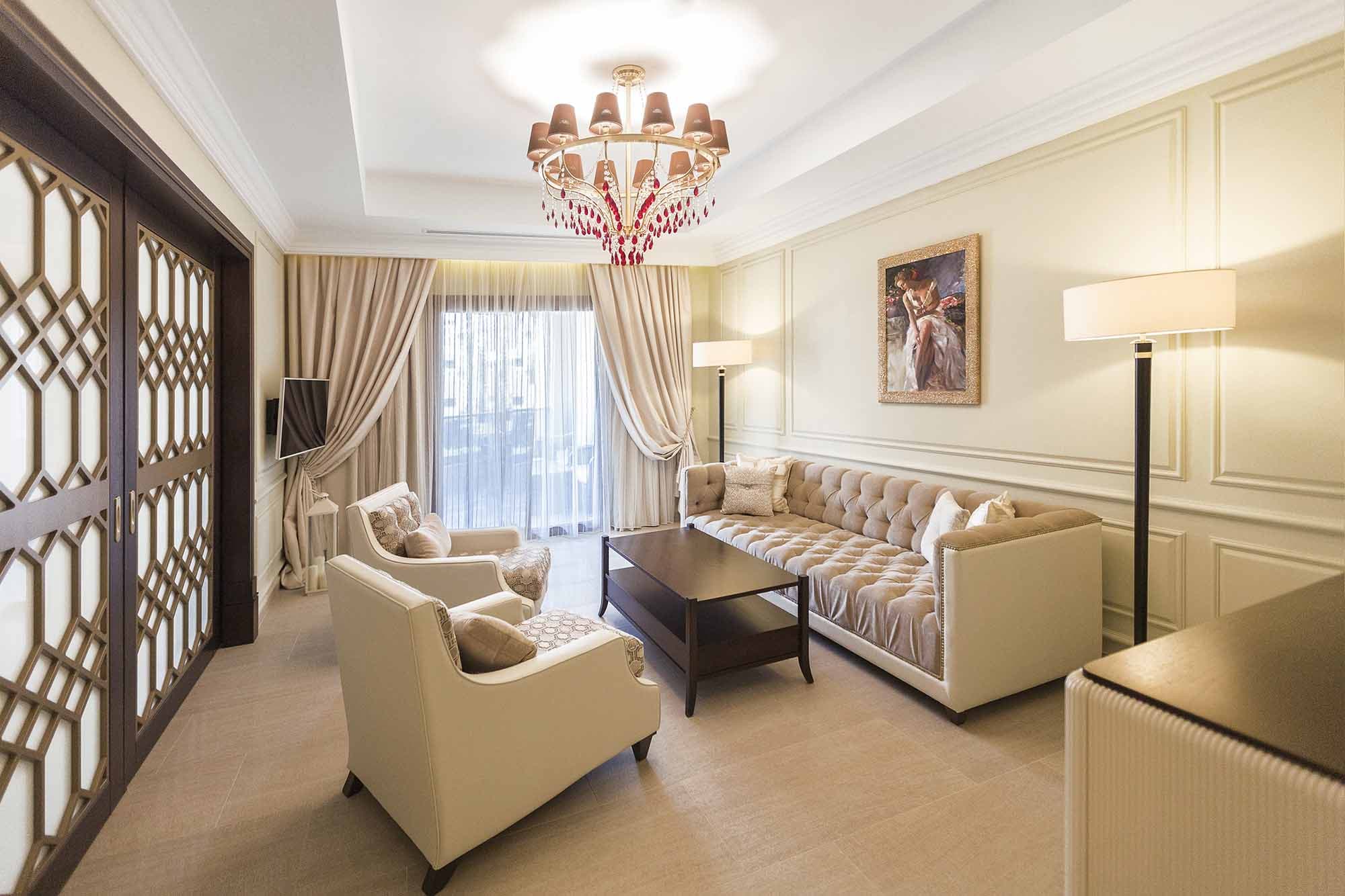 Кондиционер/отопление, спутниковое телевидение, DVD-плеер, Wi-Fi доступ в Интернет, телефон, сейф, мини-бар (по запросу), кофемашина Nespresso, чайник, фен, весы, халаты, тапочки.