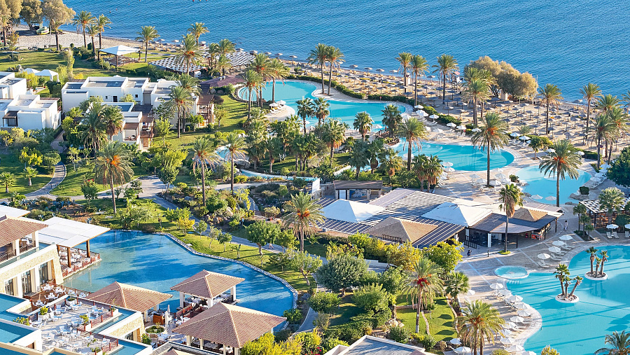 Отель состоит из главного корпуса и комплекса бунгало, напоминающего небольшой прибрежный поселок. Водный рай готов принять гостей всех возрастов: извилистая речка соединяет два оригинальных бассейна, и даже таверна окружена со всех сторон бассейном. Великолепные холлы и просторные террасы создают ощущение блеска и роскоши. Отель расположен на великолепном пляже в 4 км от центра города Кос, неподалеку от развалин Асклепиона, где практиковал основатель медицинской науки Гиппократ.