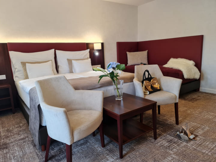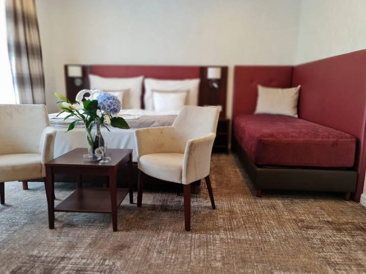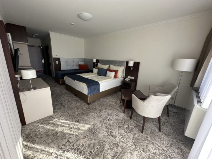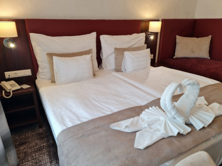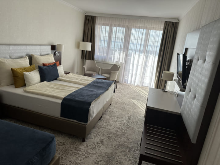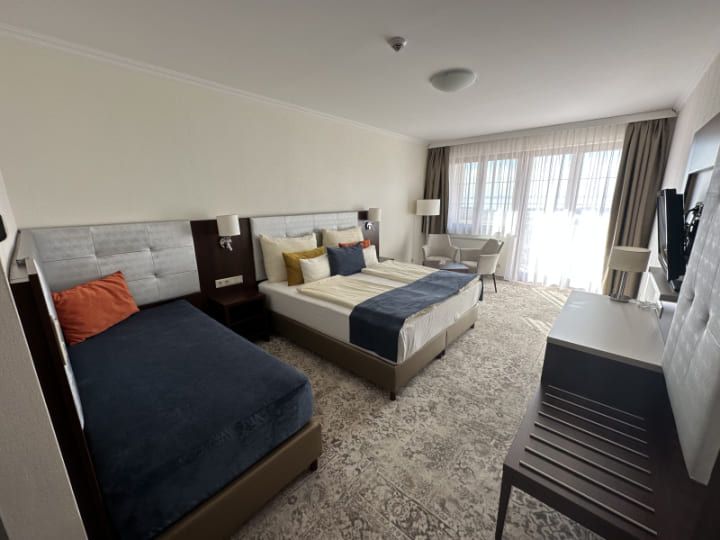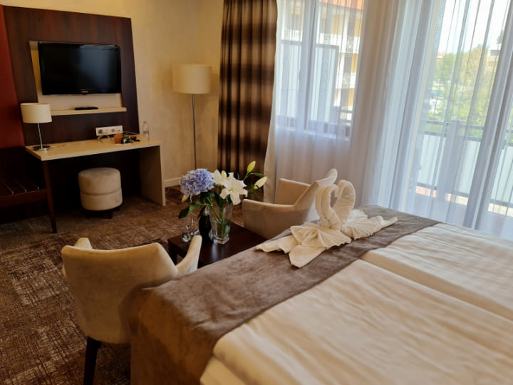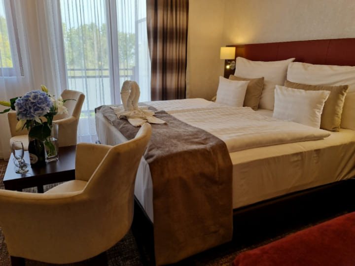 Superior deluxe room with balcony (30 кв. м): терраса, спальня с двуспальной кроватью, ванная комната с ванной или душевой кабиной. Панорамный вид на озеро Балатон.