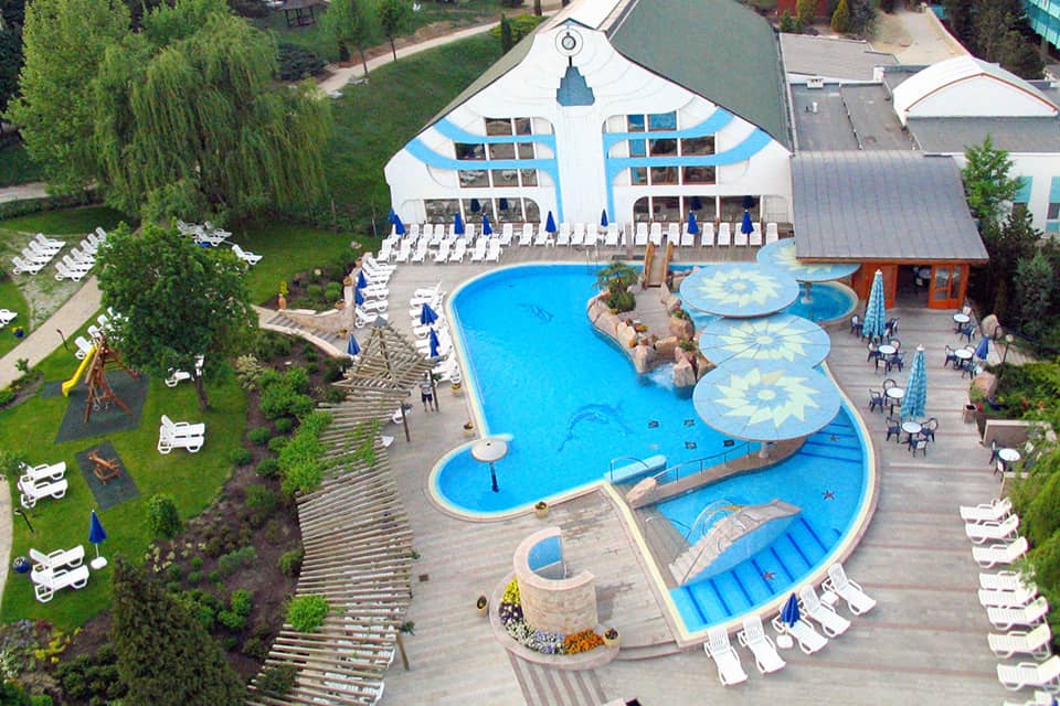 Здесь гостей круглый год ждет отдых в средиземноморских садах с великолепным пейзажным бассейном, площадь которого составляет 1000 кв. м, термальной купальней, напоминающей о Древнем Риме, и всевозможными оздоровительными удобствами и процедурами.