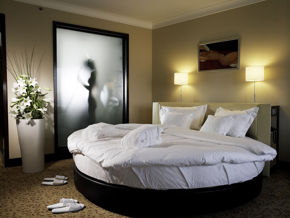 Double room Oriental (30-37 кв. м): спальня с круглой двуспальной кроватью, ванная комната.