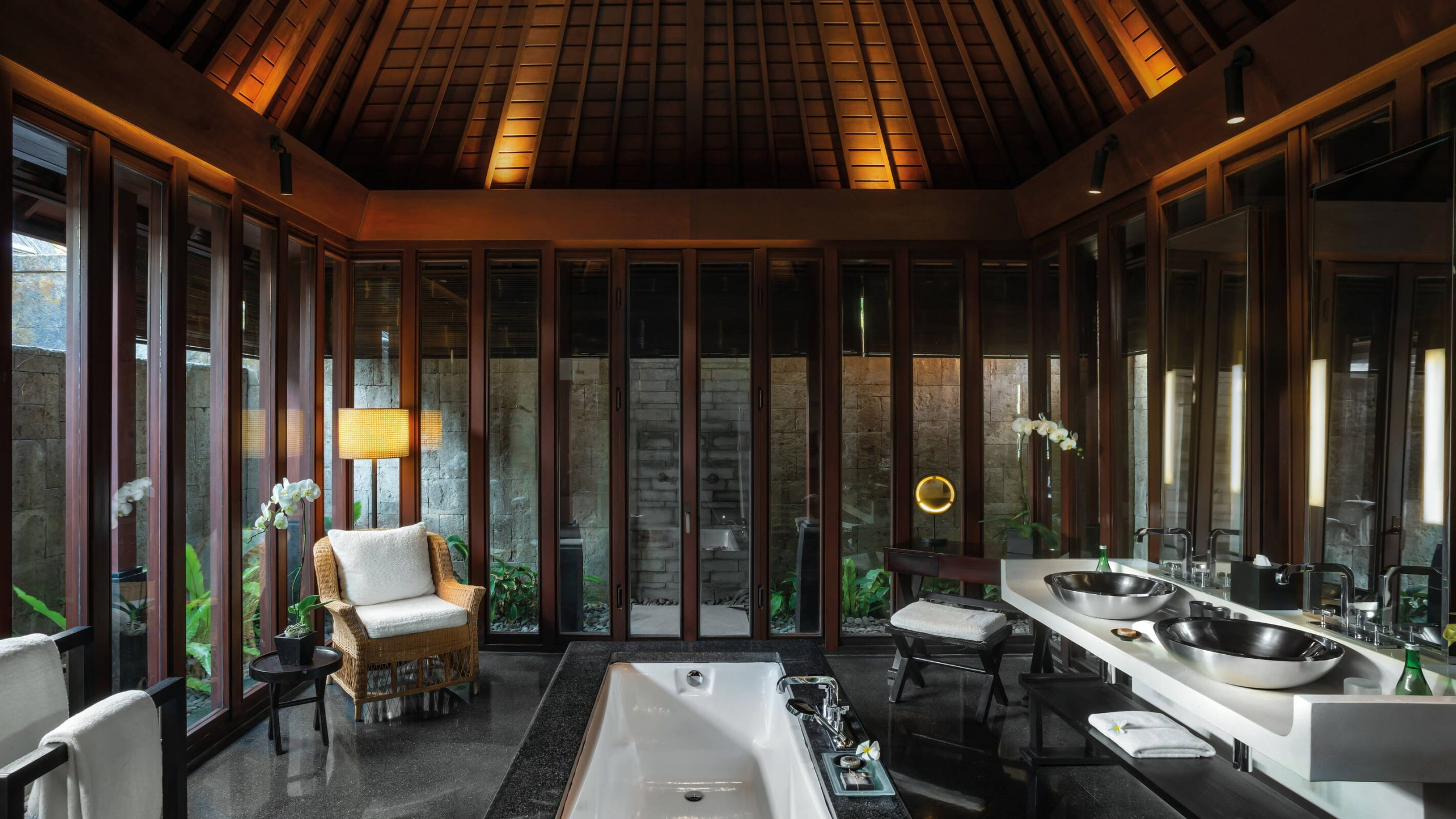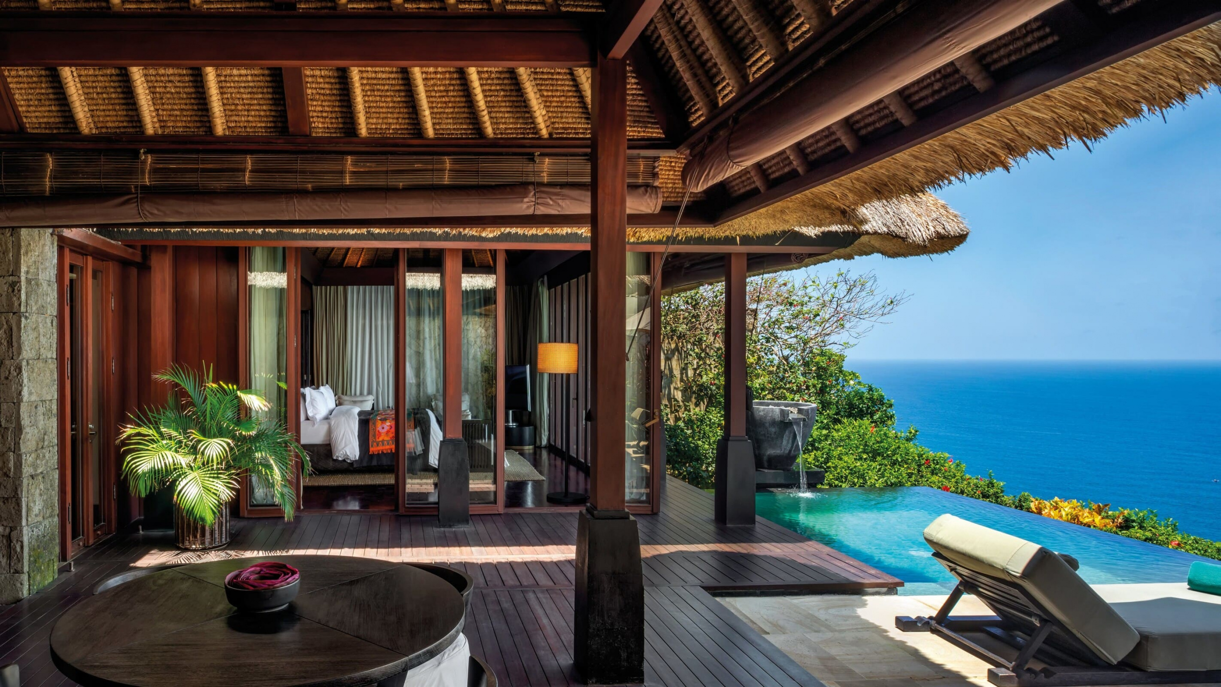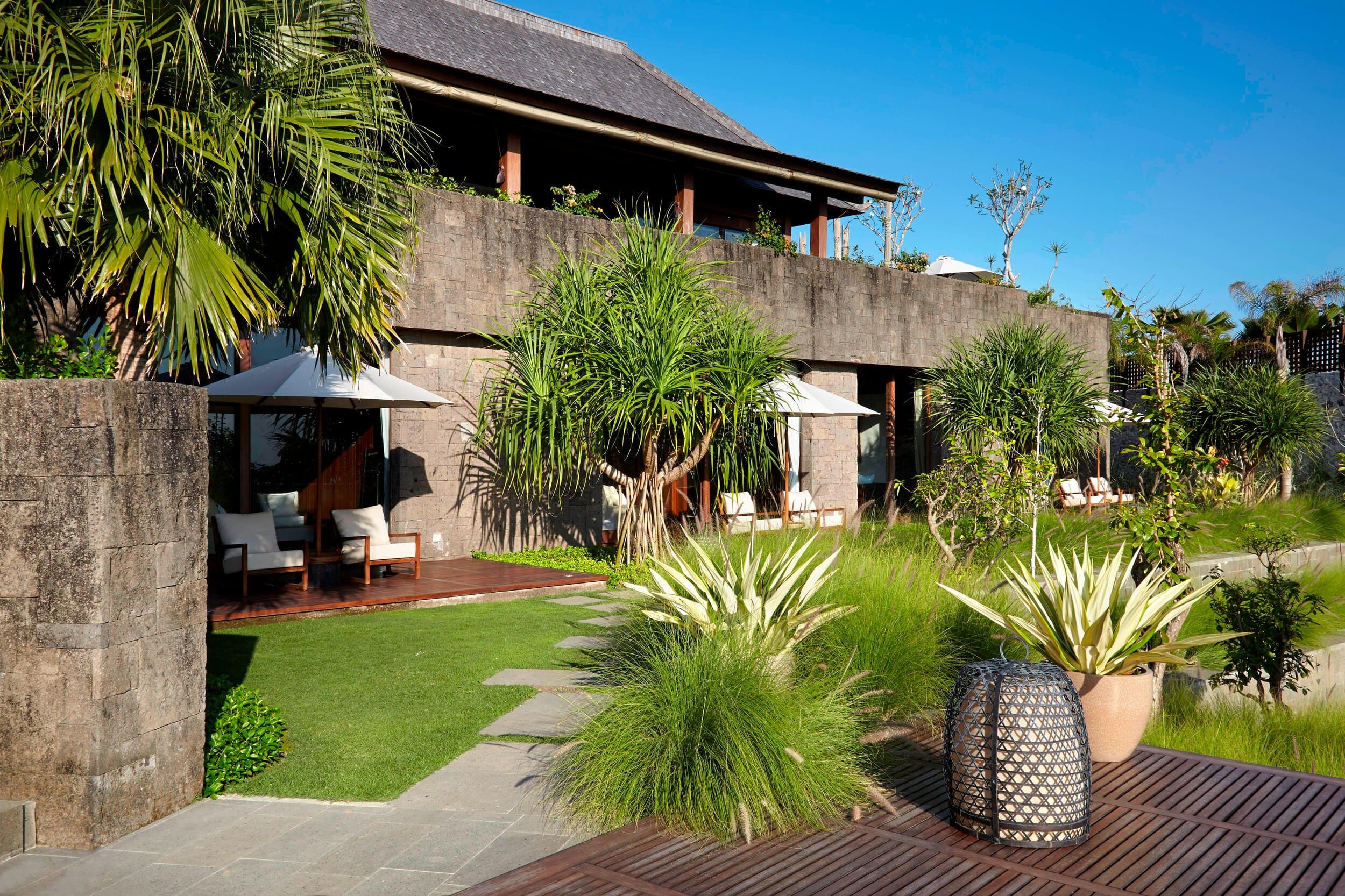 Просторные виллы курортного отеля Bulgari Bali оформлены в традиционном балийском стиле. В числе удобств — аудиовизуальная система. Из ванной комнаты через французские окна открывается вид на отдельный внутренний двор.