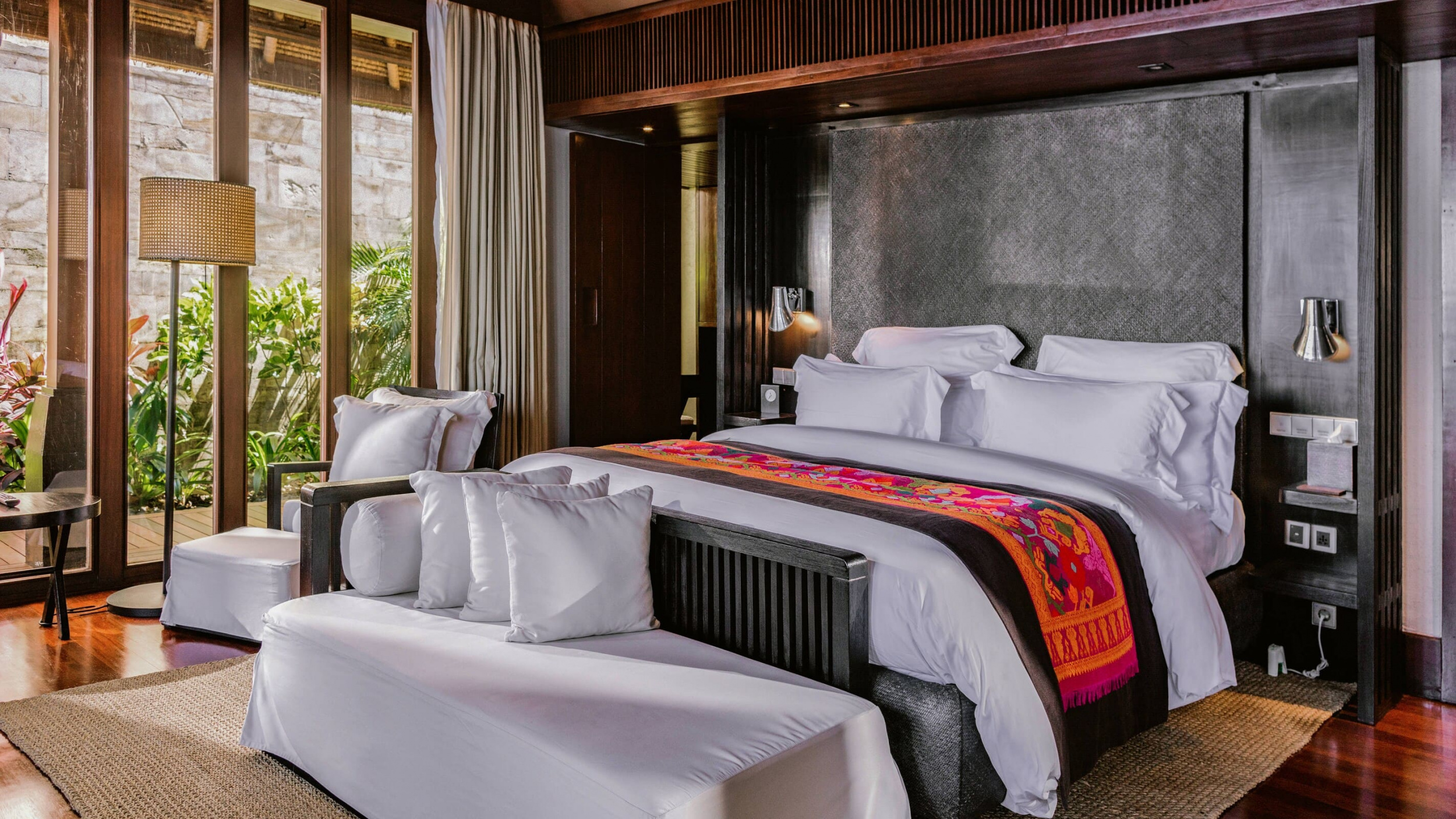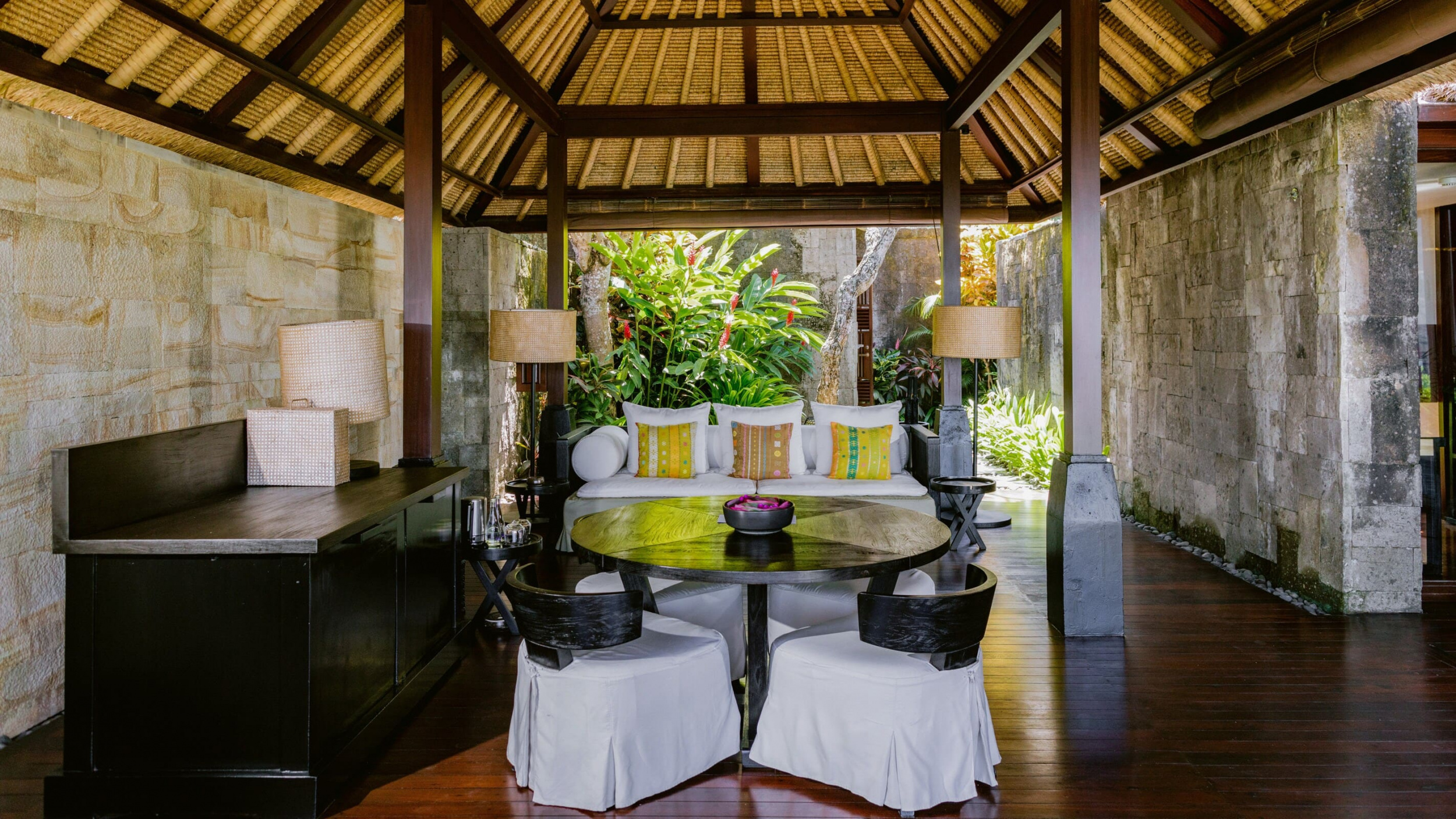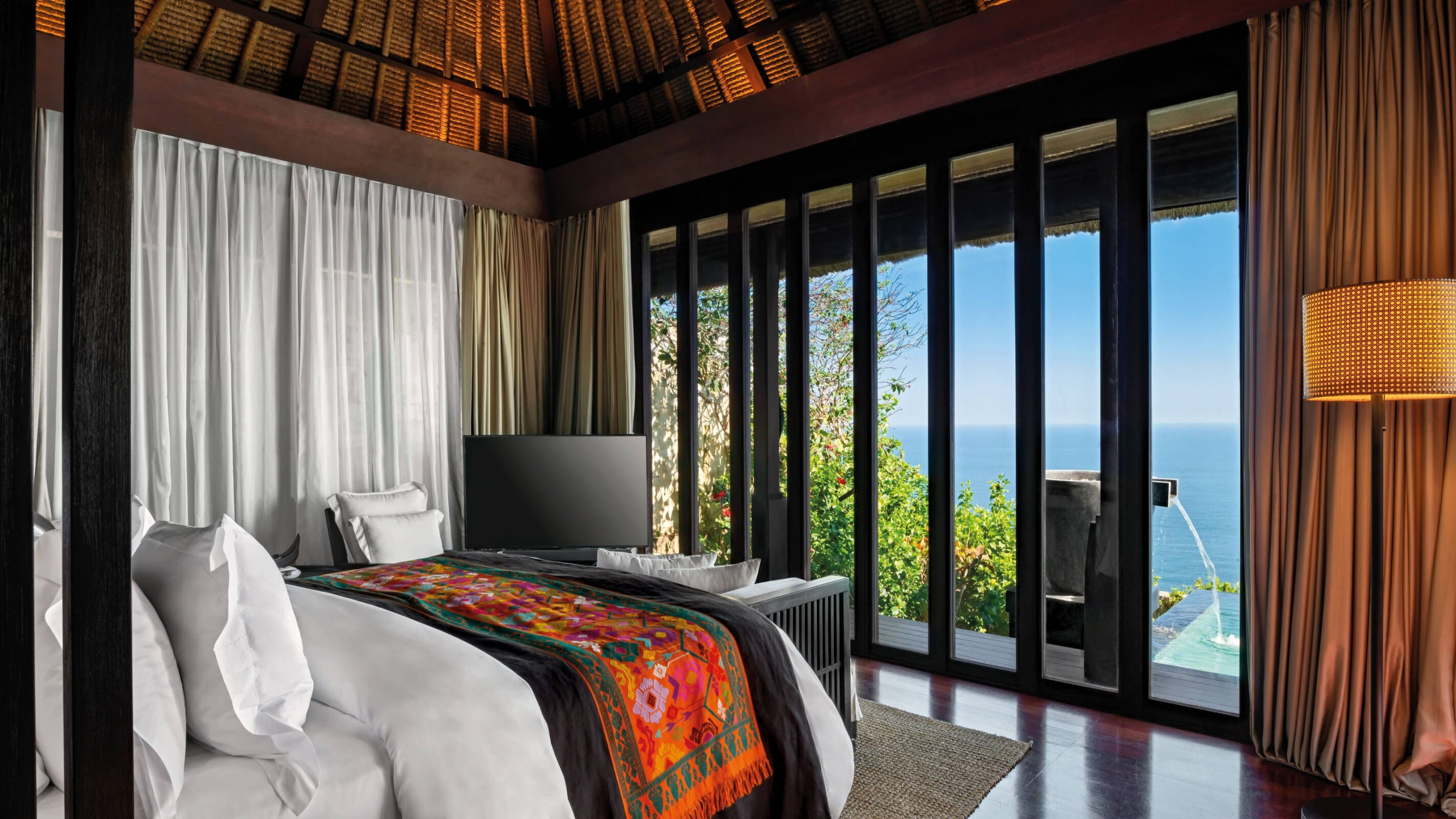 Просторные виллы курортного отеля Bulgari Bali оформлены в традиционном балийском стиле. В числе удобств — аудиовизуальная система. Из ванной комнаты через французские окна открывается вид на отдельный внутренний двор.