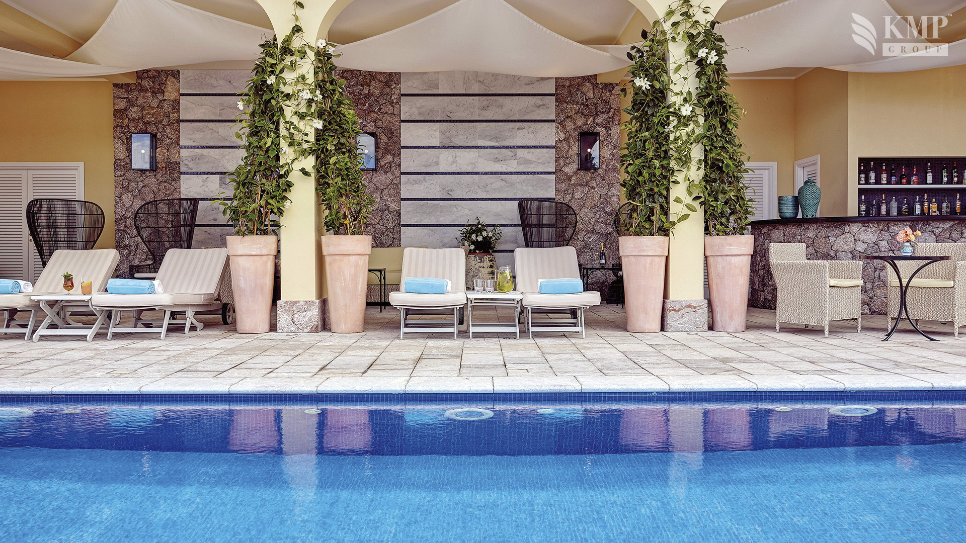 Exclusive suite (52-69 кв. м). Терраса с обеденной зоной на открытом воздухе, спальня с гостиной зоной и кроватью king-size, ванная комната с ванной и душевой. Вид на залив и пляж.