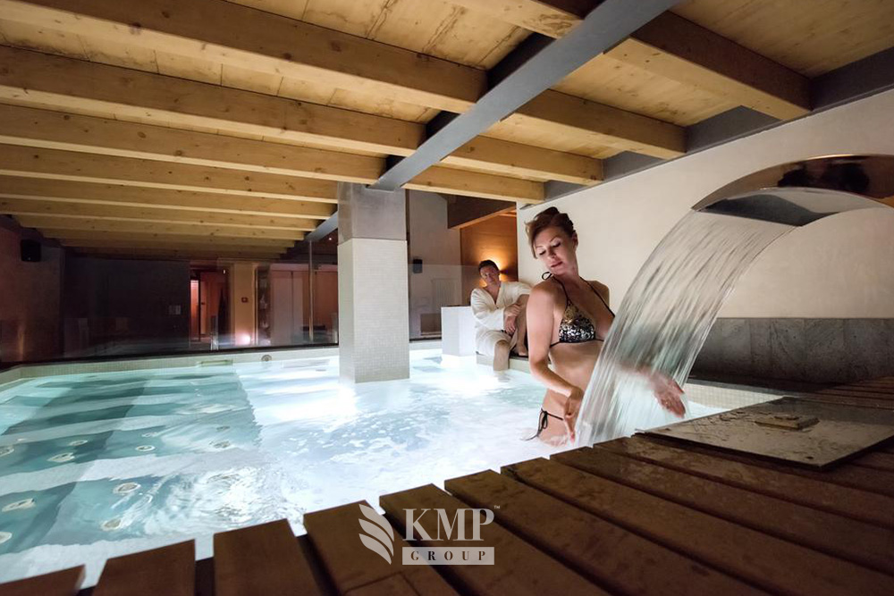 Junior Suite Prestige (41 кв. м). Комфортабельный, просторный и светлый сьют с видом на заснеженную Гору Червино и лыжные склоны. В номере есть спальня, гостиная зона и две ванные комнаты с гидромассажной ванной.