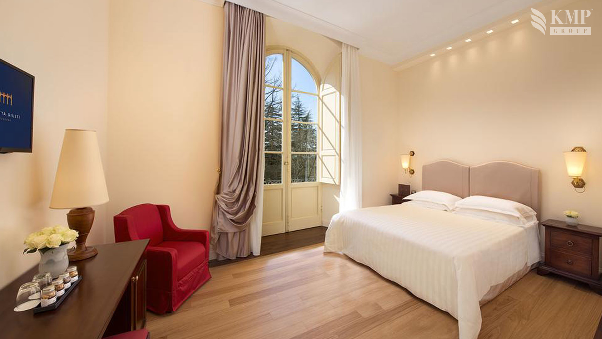 Junior suite mountain view (40 кв. м). Спальня с гостиной зоной (кровать queen-size), ванная комната с ванной и душевой кабиной. Расположены в современной части здания. Вид на гору Monsummano.
