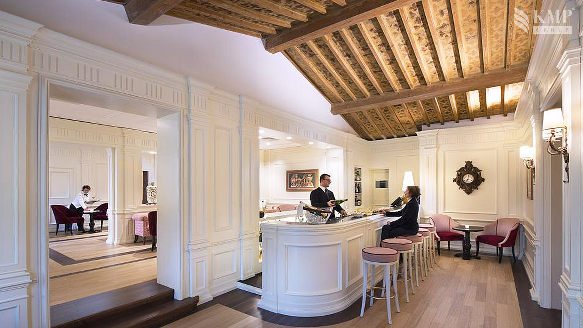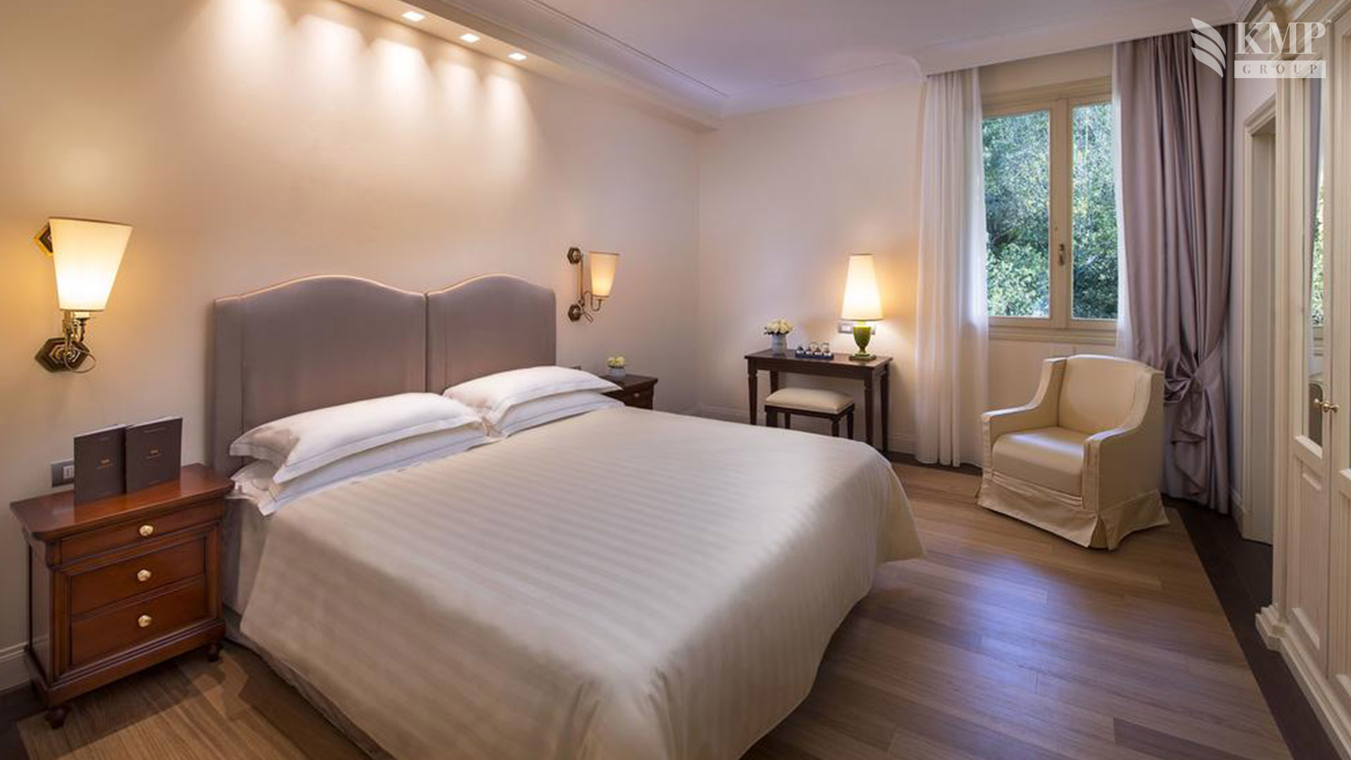 Junior suite park view (44 кв. м). Балкон, спальня с гостиной зоной (кровать queen-size), гардеробная, ванная комната с ванной и душевой кабиной. Расположены в современной части здания. Вид на парк.