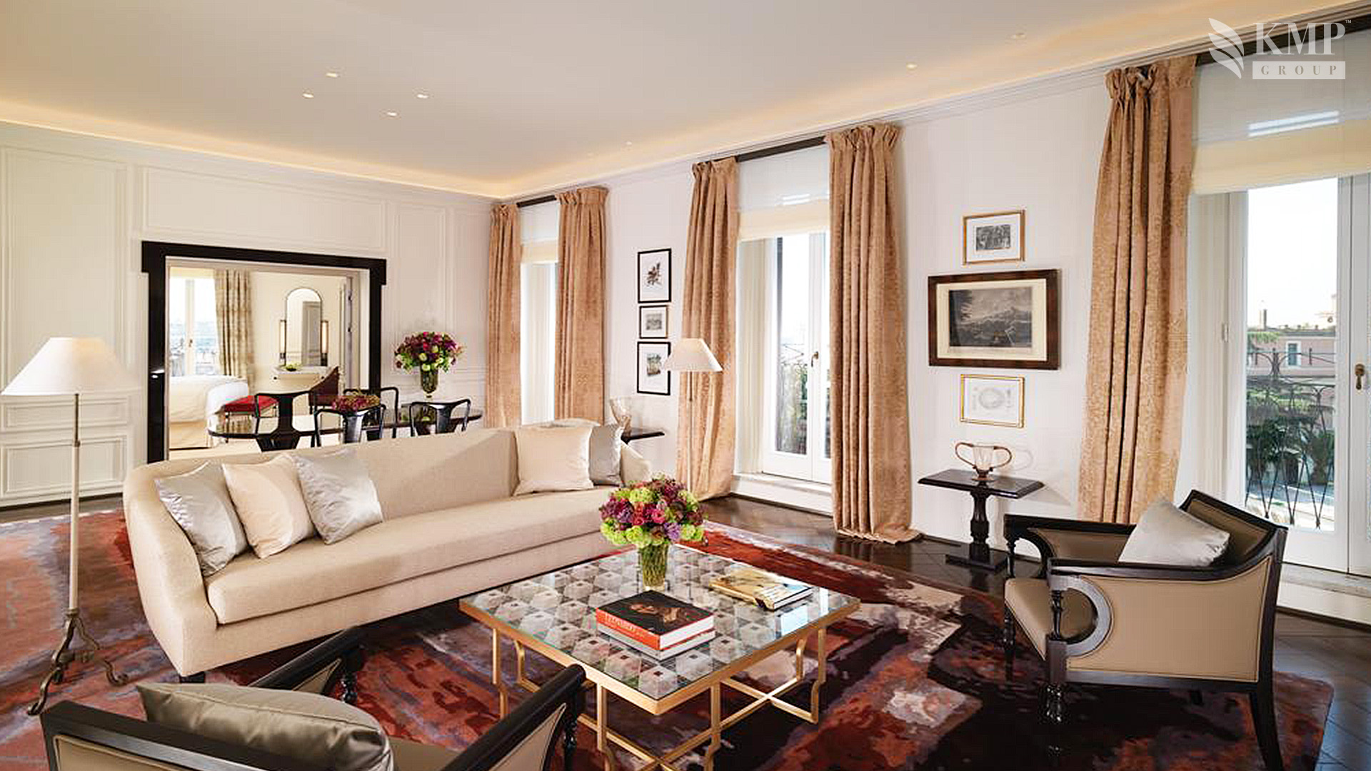Villa Medici presidential suite (125 кв. м). Балконы, гостиная зона, столовая зона, спальня с кроватью king-size, гардеробная, ванная комната с ванной и душевой, гостевой санузел. Панорамный вид на город.