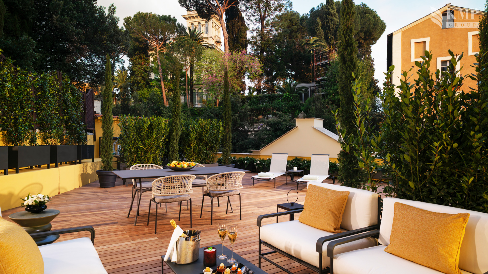 Aurora terrace suite (86 кв. м).Терраса с частным садом, фонтаном и обеденной зоной на открытом воздухе, гостиная, спальня с кроватью king-size, гардеробная, ванная комната с ванной и душевой, гостевой санузел.