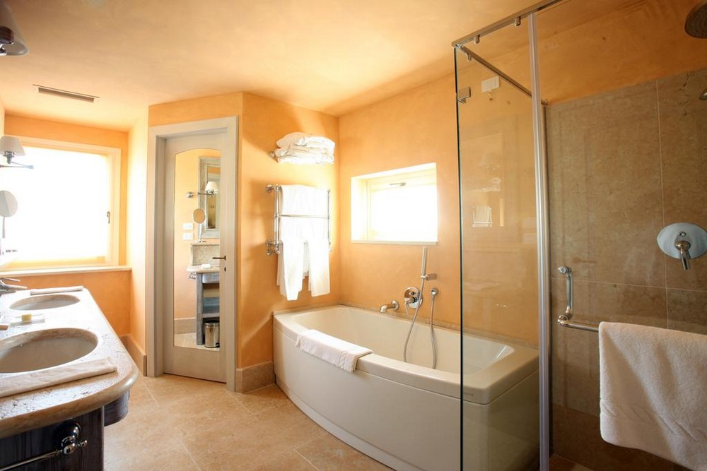 Suites: Шторы, покрывала, и постельное белье сделаны из лучших тканей – льна, тафты и атласа. Элегантные белые ванны стоят на старинном паркете из массива дуба, возле окна с видом на восхитительный пейзаж. В некоторых сьютах есть просторные душевые, размером до 3x2 метров, все напоминают римские спа.
