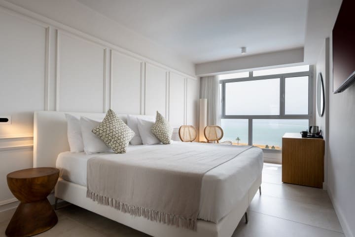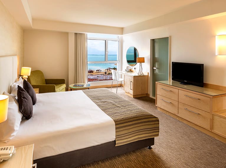 Dead Sea View Room (22 кв. м). Спальня с двуспальной кроватью, ванная комната с душевой. Вид на Мертвое море.