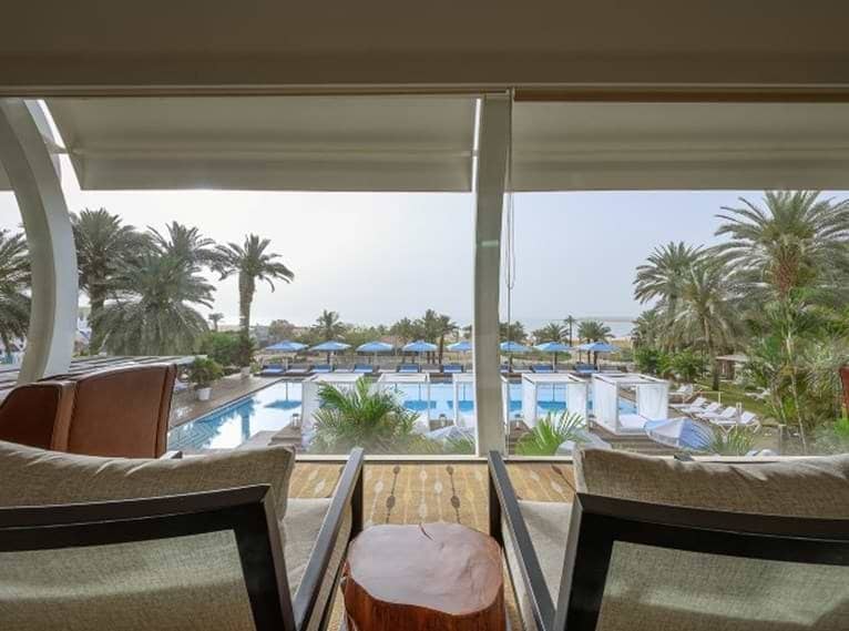 Large Dead Sea & Pool View Room (25 кв. м). Спальня с двуспальной кроватью и зоной отдыха (трансформируется в дополнительное спальное место), ванная комната с душевой. Вид на Мертвое море и бассейн.
