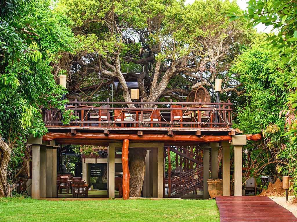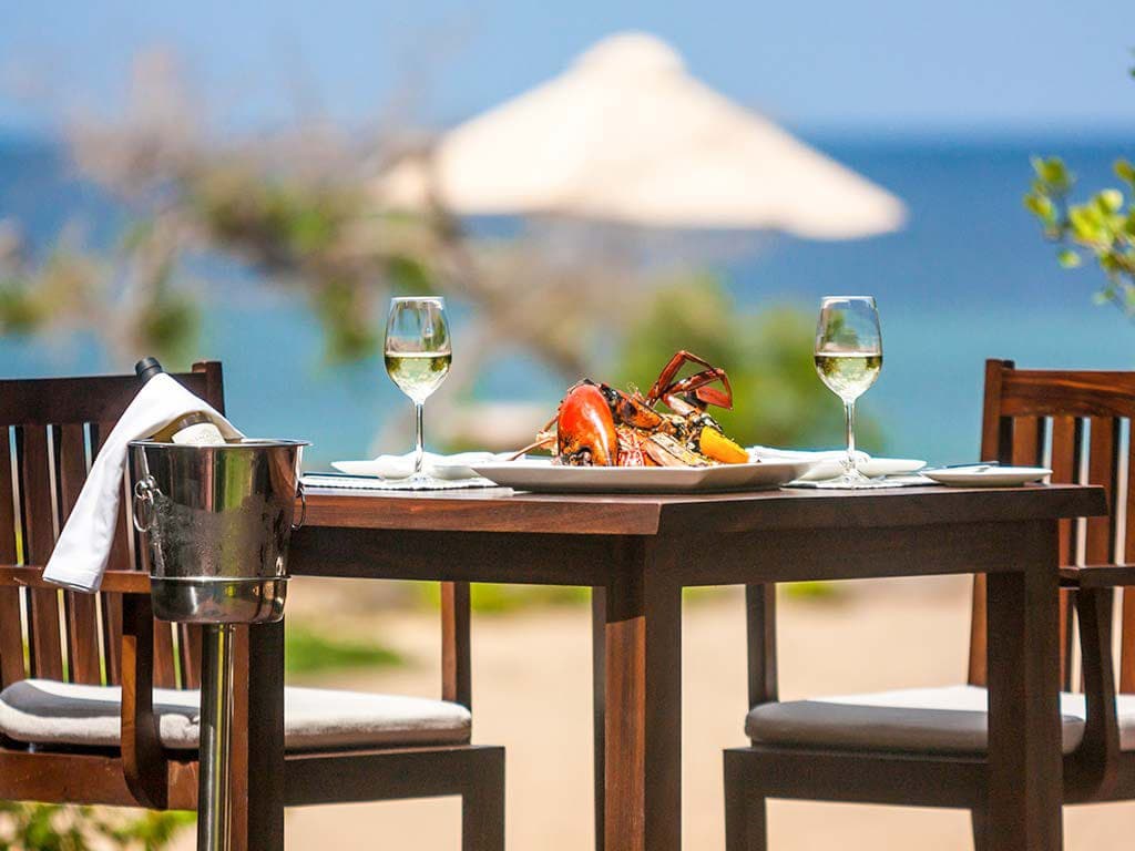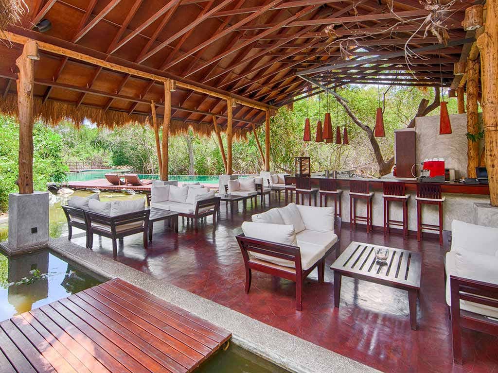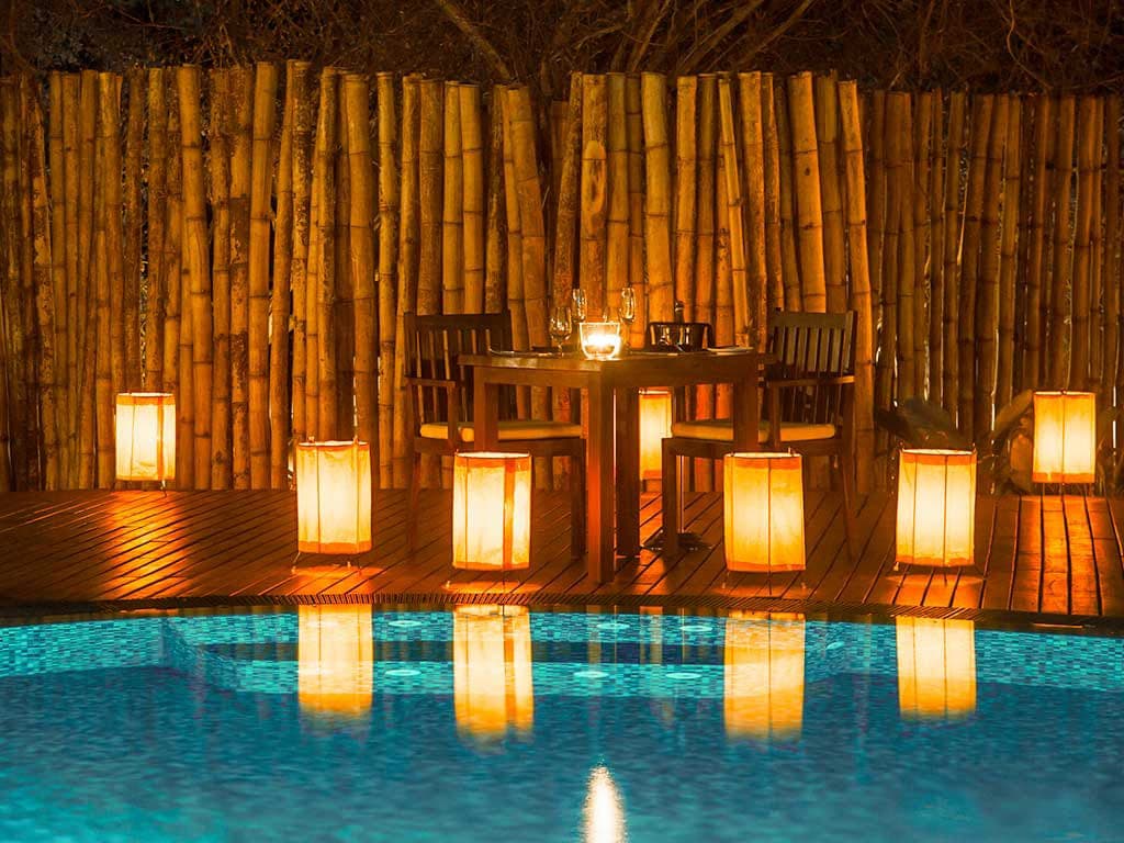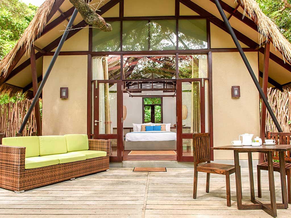 Lagoon cabin (50 кв. м). Обеденная зона на открытом воздухе, спальня с кроватью king-size, ванная комната с душем с функцией «тропический дождь». Вид на окрестности.