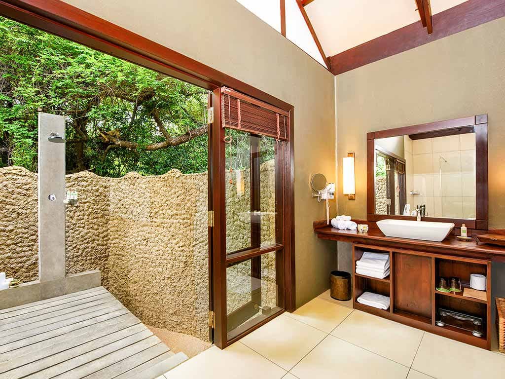 Jungle cabin (50 кв. м). Обеденная зона на открытом воздухе, спальня с кроватью king-size, ванная комната с душем с функцией «тропический дождь», душ с функцией «тропический дождь» на открытом воздухе.