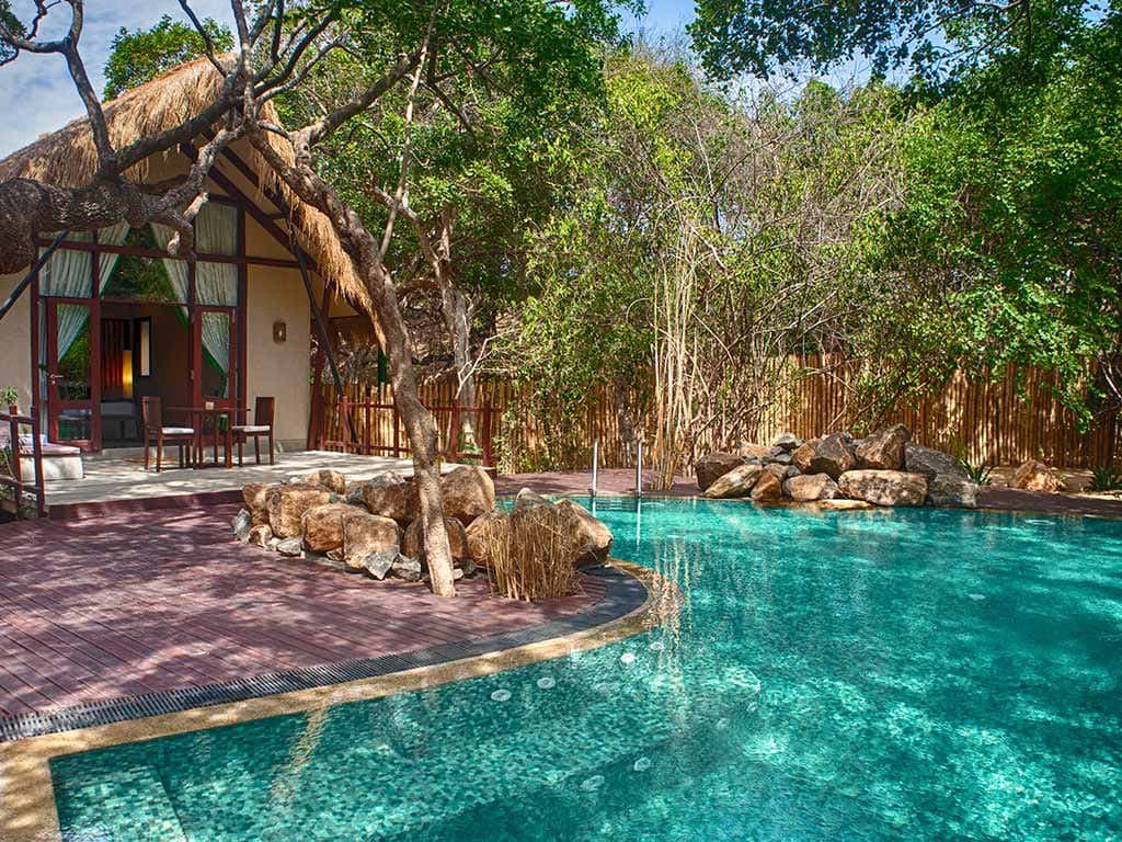 Jungle cluster villa терраса с открытым персональным бассейном и обеденной зоной на открытом воздухе, спальня с кроватью king-size, ванная комната с душем с функцией «тропический дождь», душ с функцией «тропический дождь» на открытом воздухе.