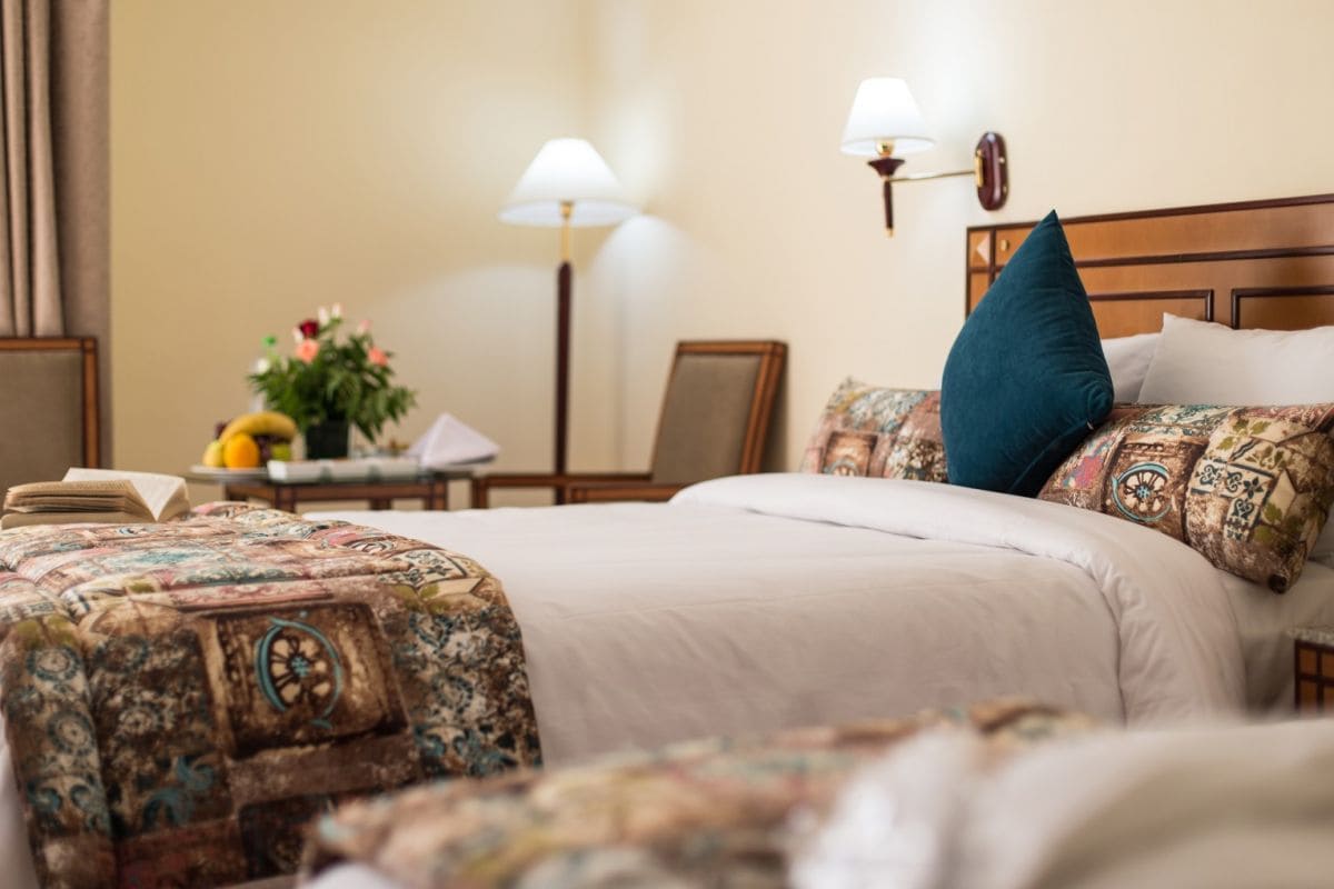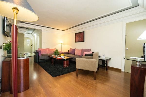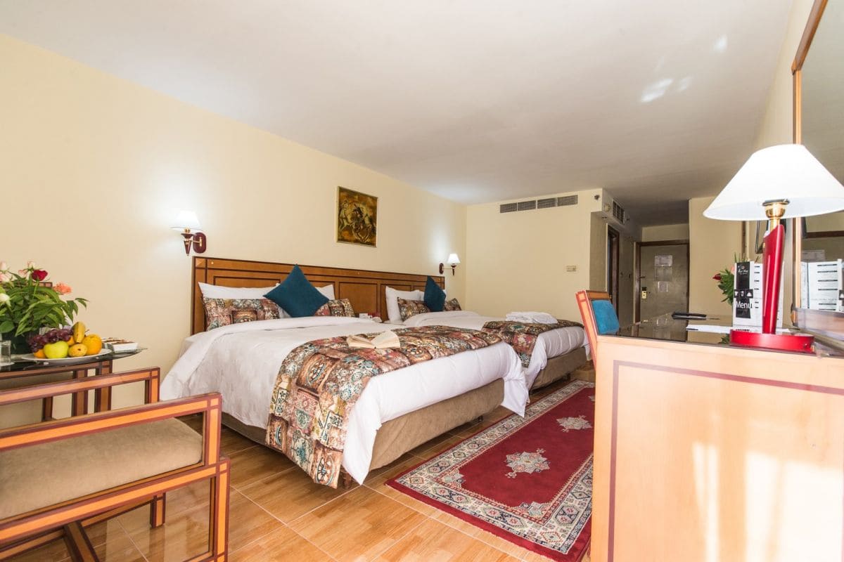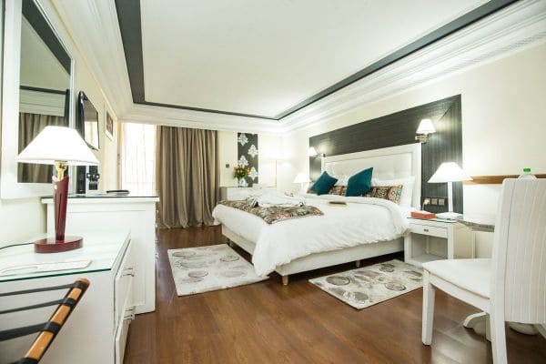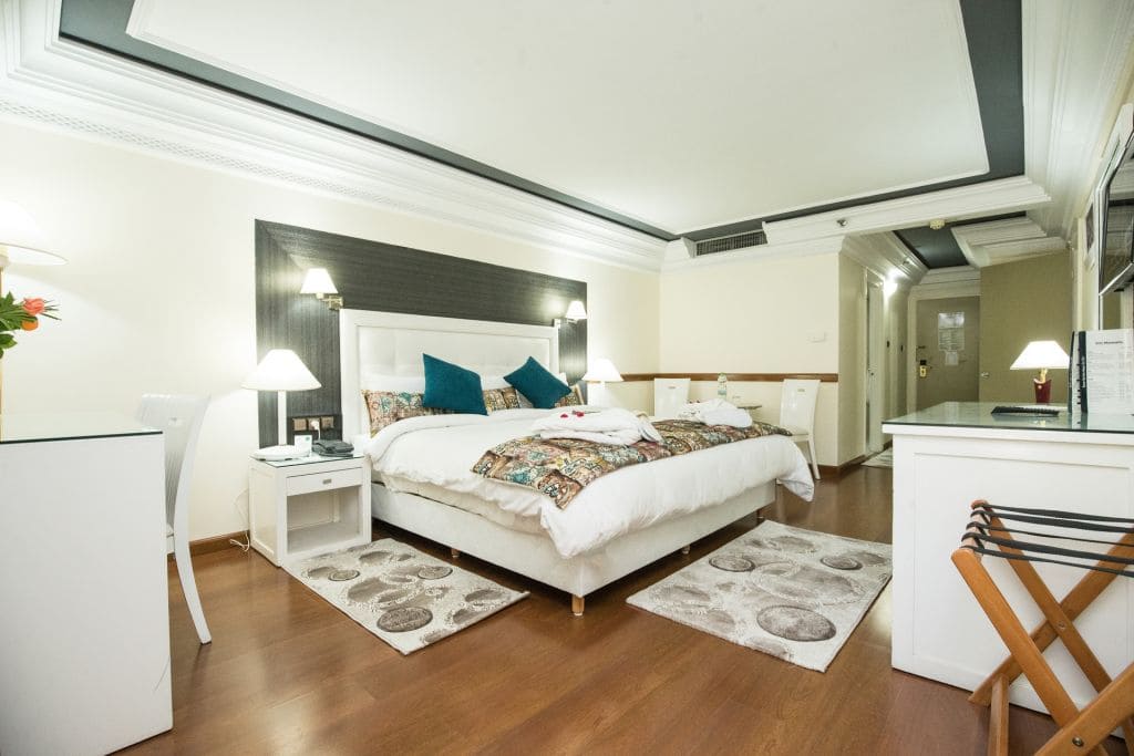 В числе стандартных удобств — кондиционер, отопление, телевизор, телефон, мини-бар, фен, тапочки, ванная комната облицована мрамором, балкон или терраса
