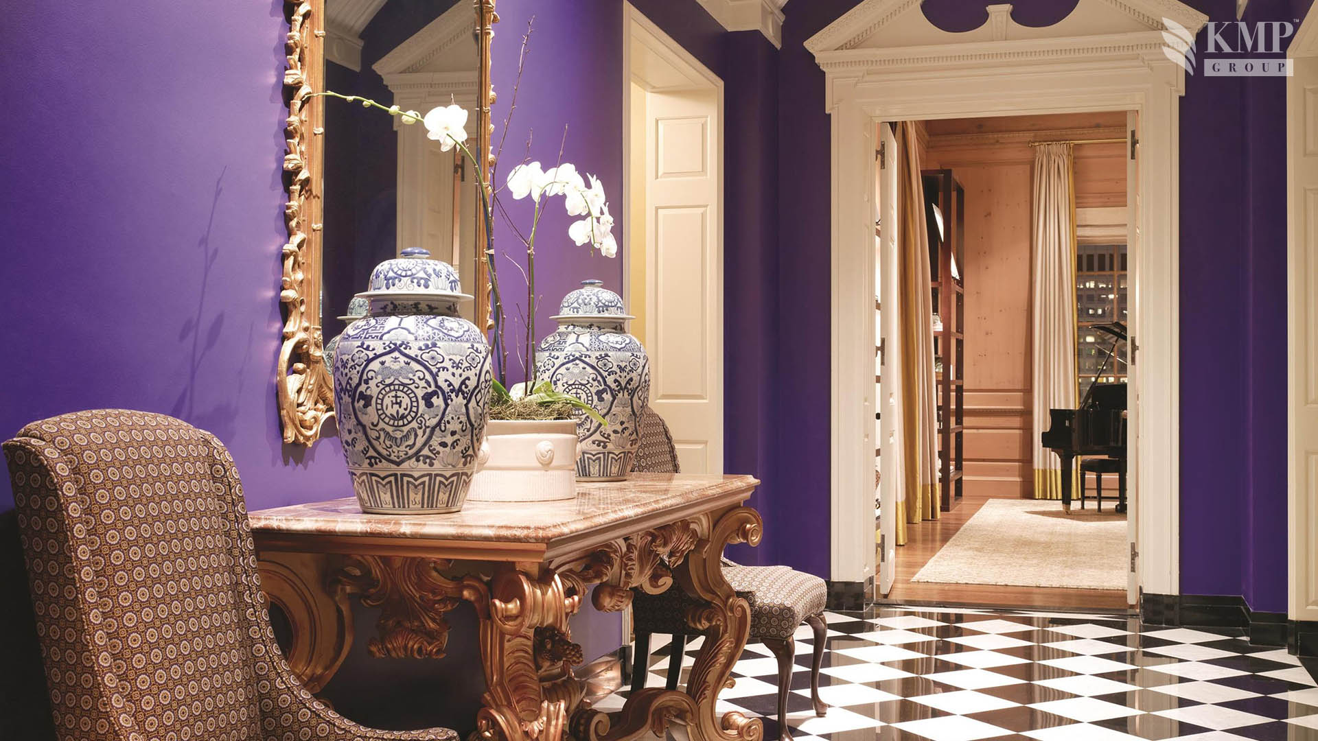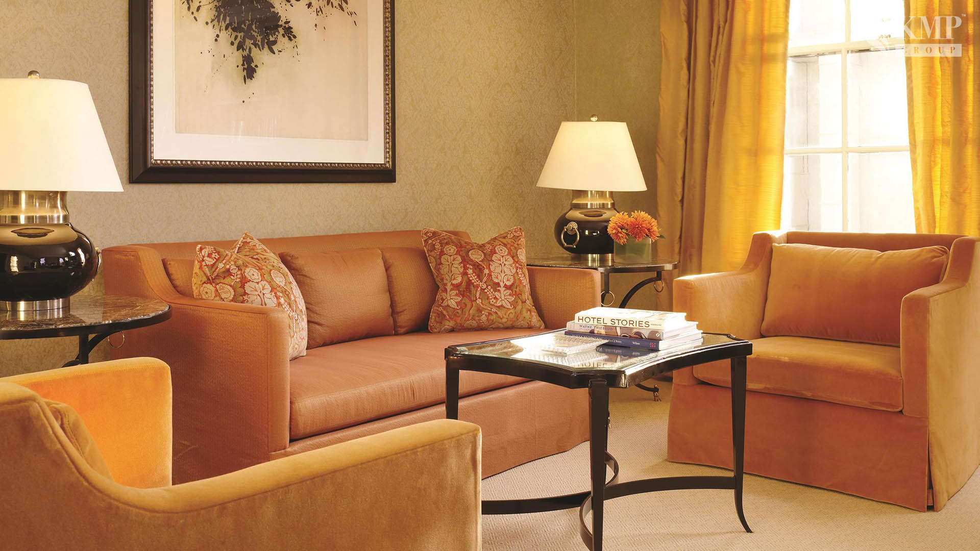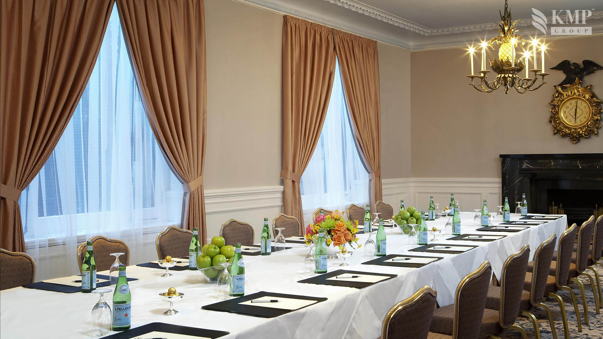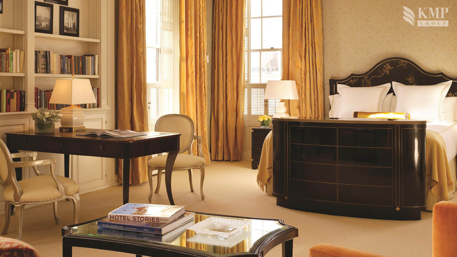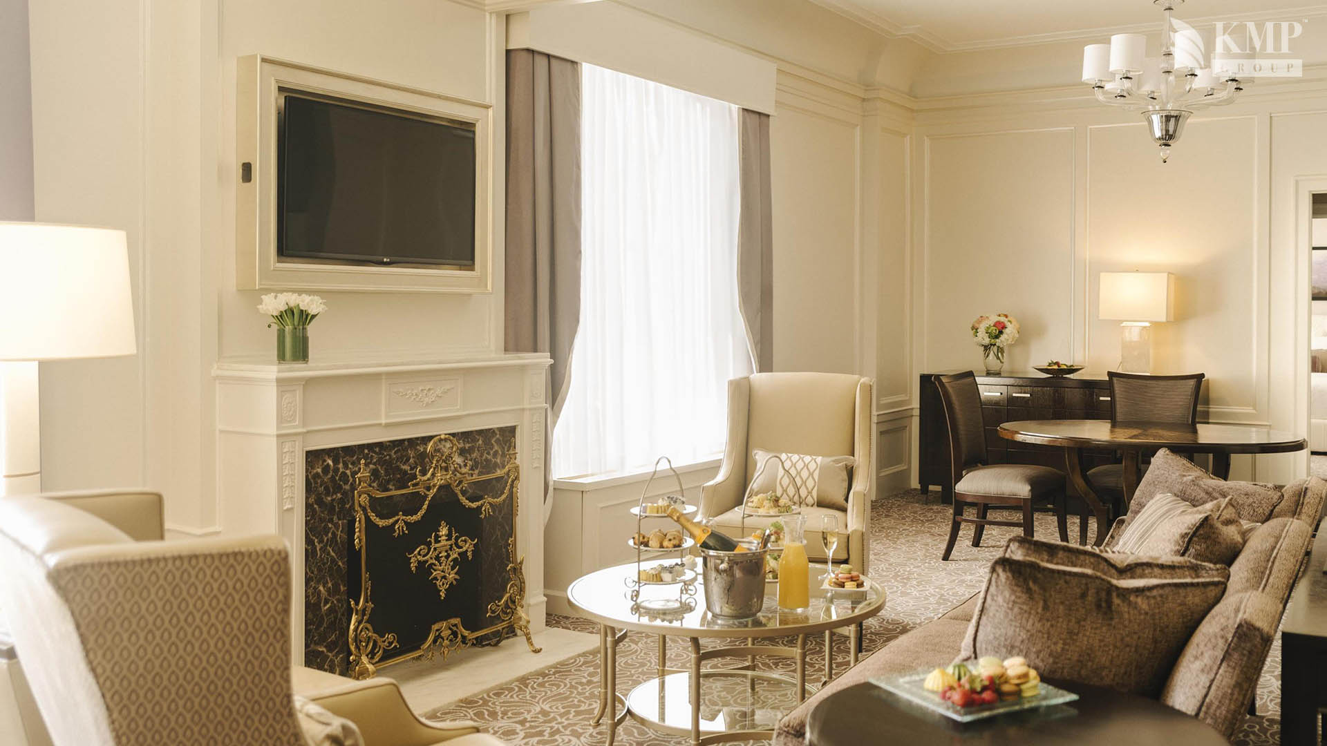 Buckingham Suite (60 кв.м): спальня с кроватью queen-size, гостиная зона с камином и барной стойкой, мраморная ванная комната с ванной и душевой кабиной, балкон с видом на город. Гостиная номера рассчитана для приема около 30-ти посетителей.