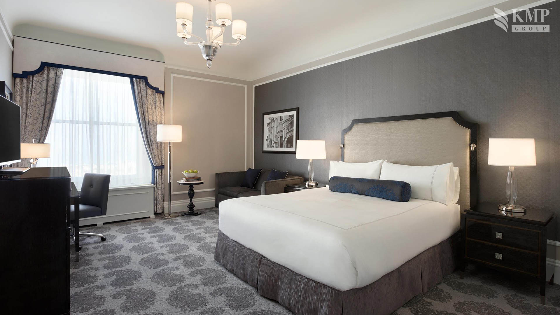 Fairmont Exterior Room (39 кв.м): кровать king-size или две кровати queen-size, просторная гостиная зона, письменный стол, мраморная ванная комната, сводчатые потолки, окна с видом на Сан-Франциско и на бухту. Номера этой категории расположены в главном здании отеля со второго по шестой этажи.
