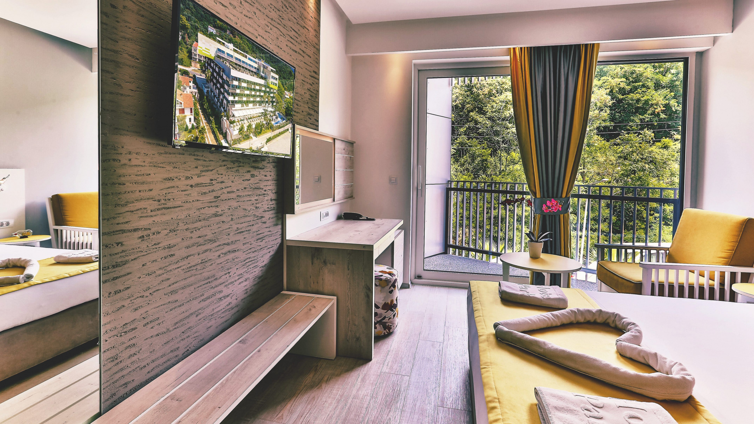 Бесплатный Wi-Fi, кондиционер, ТВ со спутниковыми каналами, сейф, мини-бар, собственная ванная комната: душ, халаты, тапочки, фен, туалетно-косметические принадлежности, балкон с видом на море или горы.