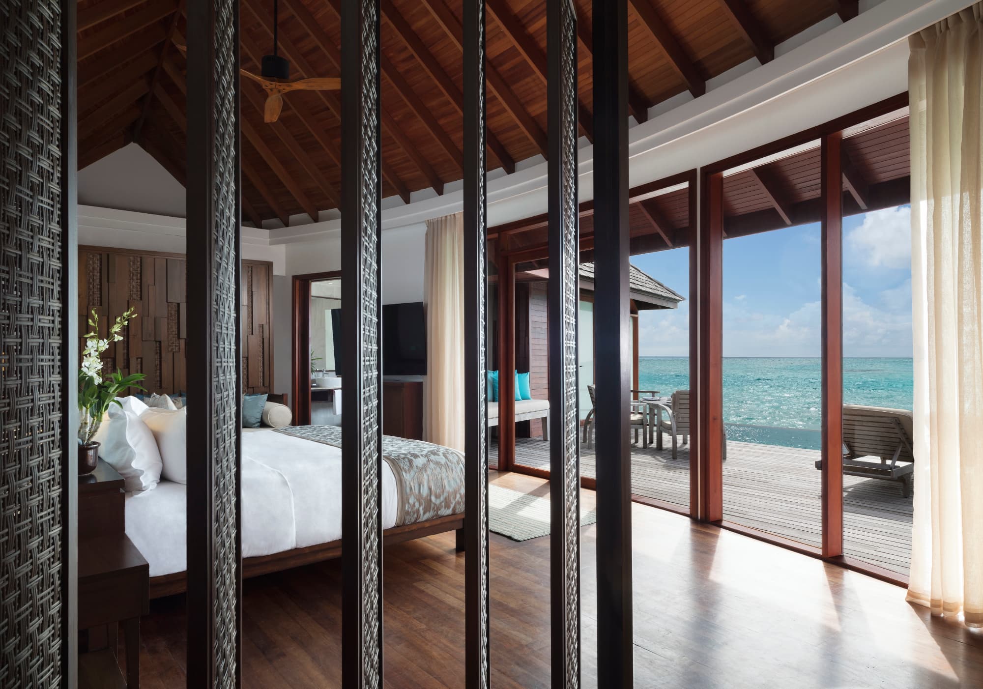 Большинство вилл отеля расположены на побережье, у кромки пляжа, позади некоторых из них есть частные садики с прохладными бассейнами. Некоторые виллы построены прямо в воде и вынесены далеко в море, так что сразу возникает ощущение жизни посреди океана.