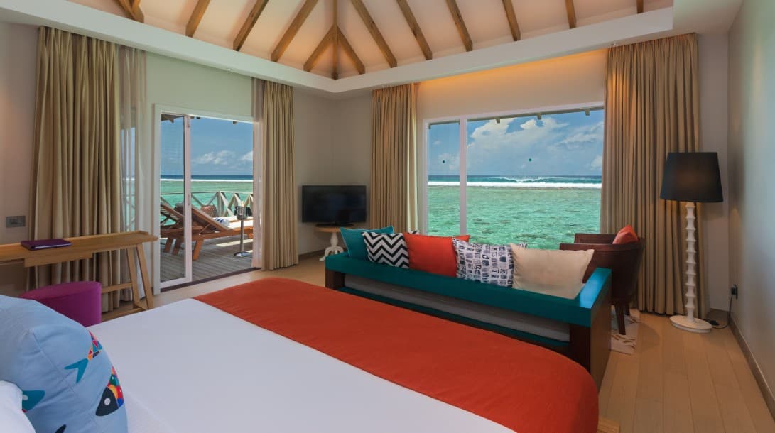 Из окон открывается потрясающий вид на океан. Номера расположены под соломенной крышей. В люксах есть просторная гостиная зона и собственный балкон.