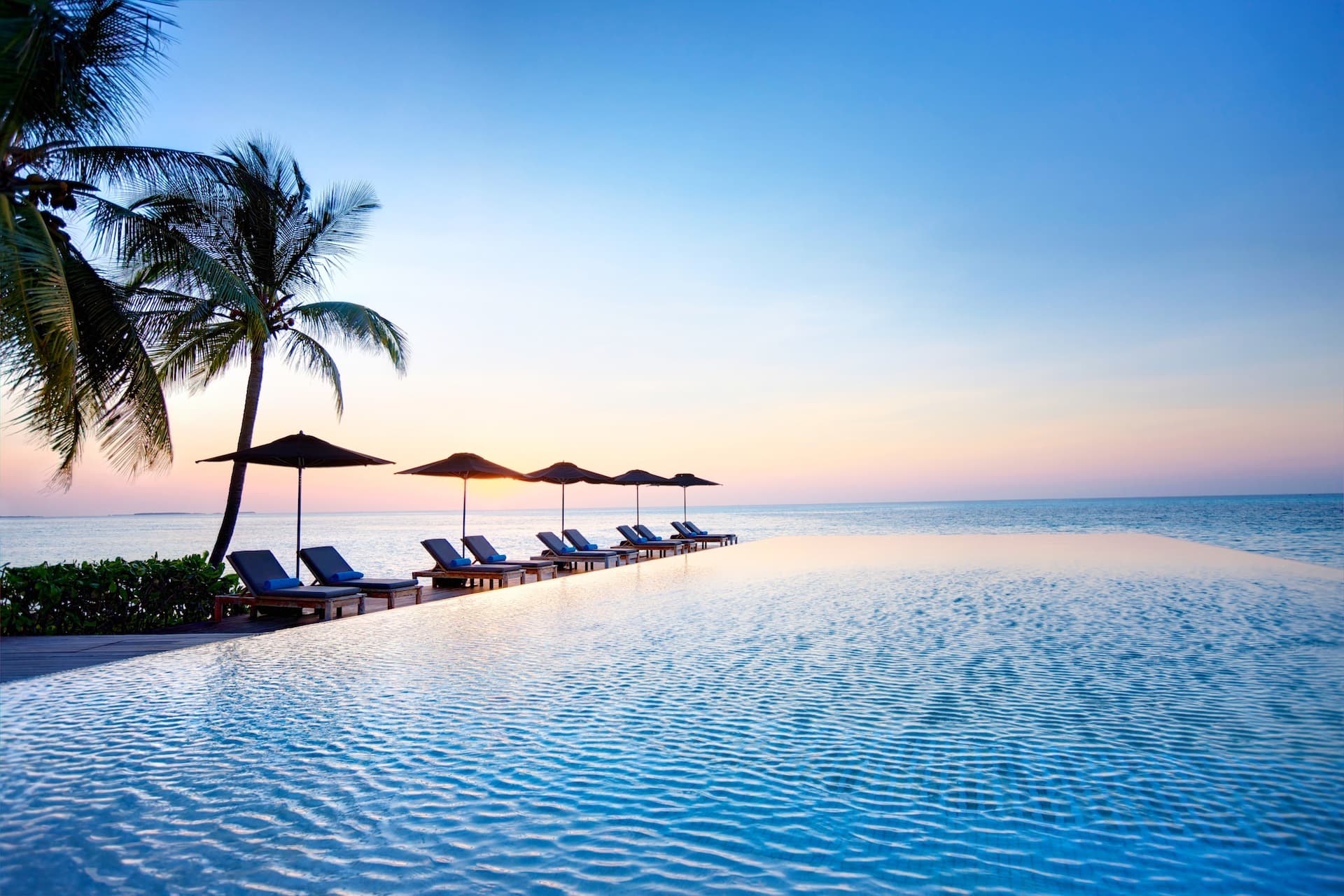 Temptation pool water villa (220 кв. м). Терраса с обеденной зоной и открытым персональным бассейном, гостиная, спальня с кроватью king-size, гардеробная, ванная комната с душем с функцией «тропический дождь». Дополнительно: джакузи, домашний кинотеатр. Расположены на сваях над водой. Спуск в лагуну. Вид на рассвет.