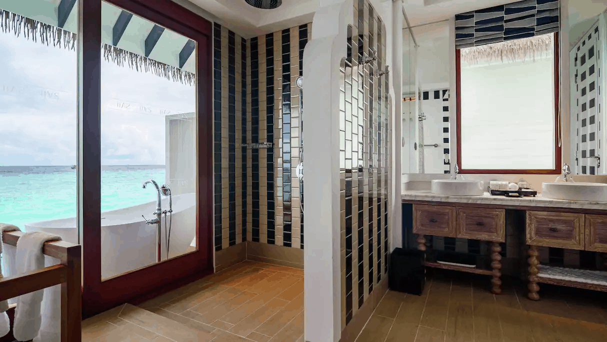 Two Bedroom Overwater Villa (240 кв. м). Состоит из двух спален (с кроватью king-size и двумя кроватями twin), открытой гостиной в форме «гнезда», двух ванных комнат с ливневым душем, ванны на открытом воздухе, большой террасы с зоной отдыха, видом на океан и спуском в лагуну. Виллы расположены над водой в лагуне. Максимальное размещение – 4 взрослых + 2 ребенка.