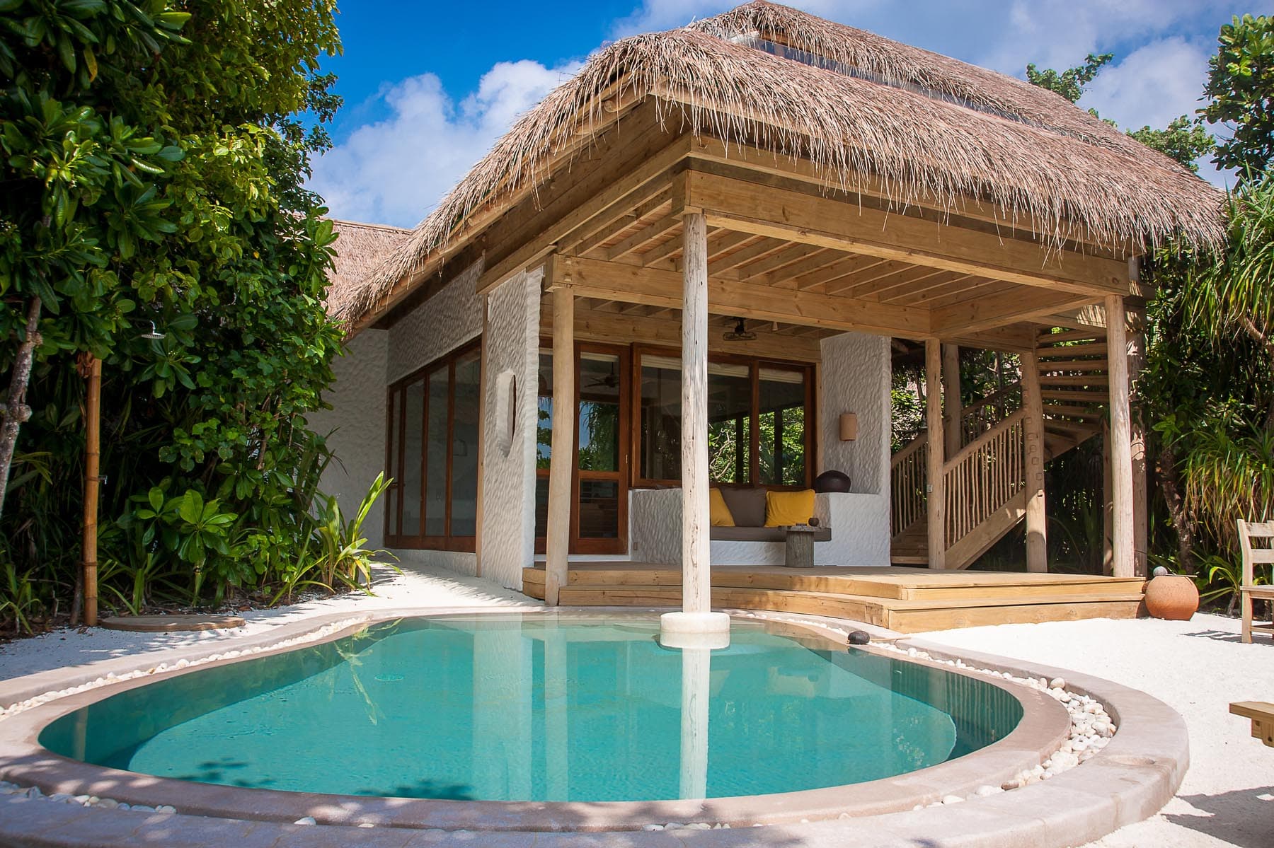 В большом собственном саду обустроены фирменные ванные комнаты с душем на открытом воздухе и отдельной ванной. К услугам гостей просторные, роскошные виллы, укрытые густой листвой деревьев.