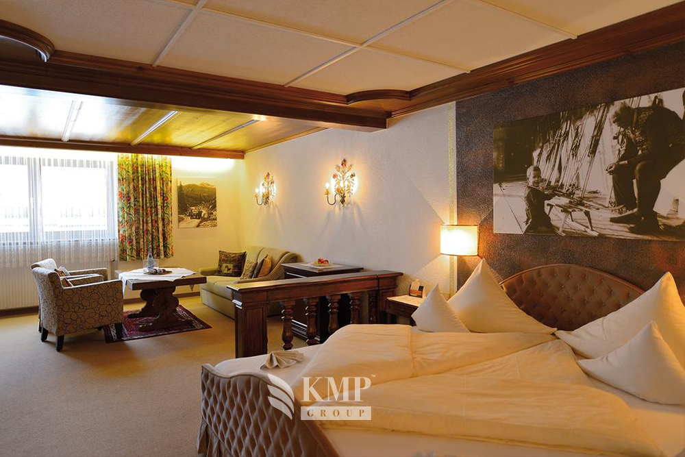 Jagdherrenzimmer junior suite smaller спальня с гостиной зоной (двуспальная кровать), ванная комната с ванной.