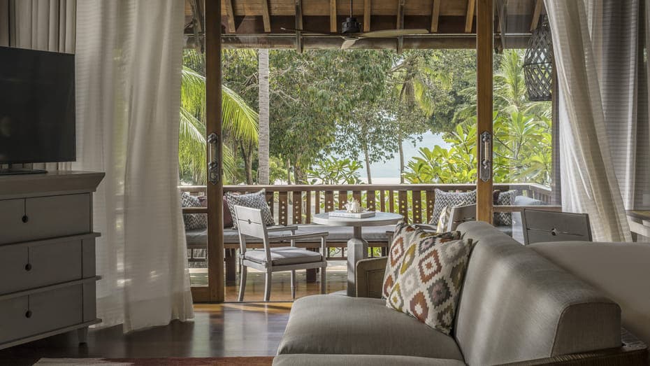 Посетителям ресторана Serai предложат средиземноморские блюда. Пиццу, приготовленную на дровах, и свежие морепродукты можно заказать в ресторане Kelapa Grill. Кроме того, на территории отеля работает бар Rhu, где гостям предлагается широкий выбор вин и пива. Здесь же можно заказать вечерние коктейли. В курортном отеле предлагается услуга доставки еды и напитков в номер и организации индивидуального ужина. Из окон номеров открывается вид на сад или море.
