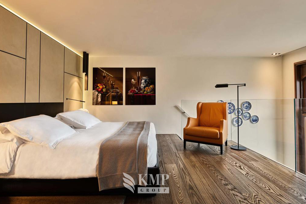 Grand duplex suite (55-64 кв. м). Двухуровневый номер. На нижнем уровне: гостиная зона, ванная комната с ванной и душем. На верхнем уровне: спальня, ванная комната с душем с функцией «тропический дождь».