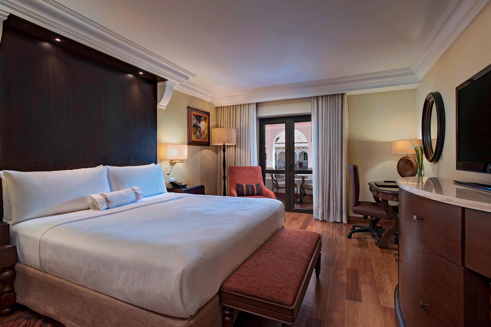 Изысканные номера отеля JW Marriott El Convento Cusco обставлены мебелью из темного дерева и мягкими креслами.