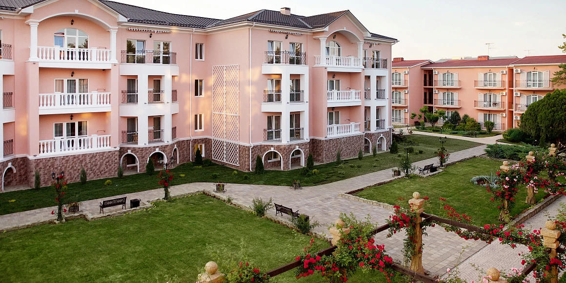 Люкс «Дольче Вита» 2-комнатный 47 кв.м (2 доп. места). Балкон оборудован сушилкой. Мебель: двуспальная кровать, журнальный столик, зеркало, кресло 2 прикроватные тумбочки пуфик, раскладной диван, стулья, туалетный столик, шкаф, мини-холодильник, набор посуды, сейф, сплит-система, два ЖК телевизора телефон, чайный набор посуды, электрочайник. Санузел: с ванной, таз, тапочки, туалетные принадлежности, фен, халат