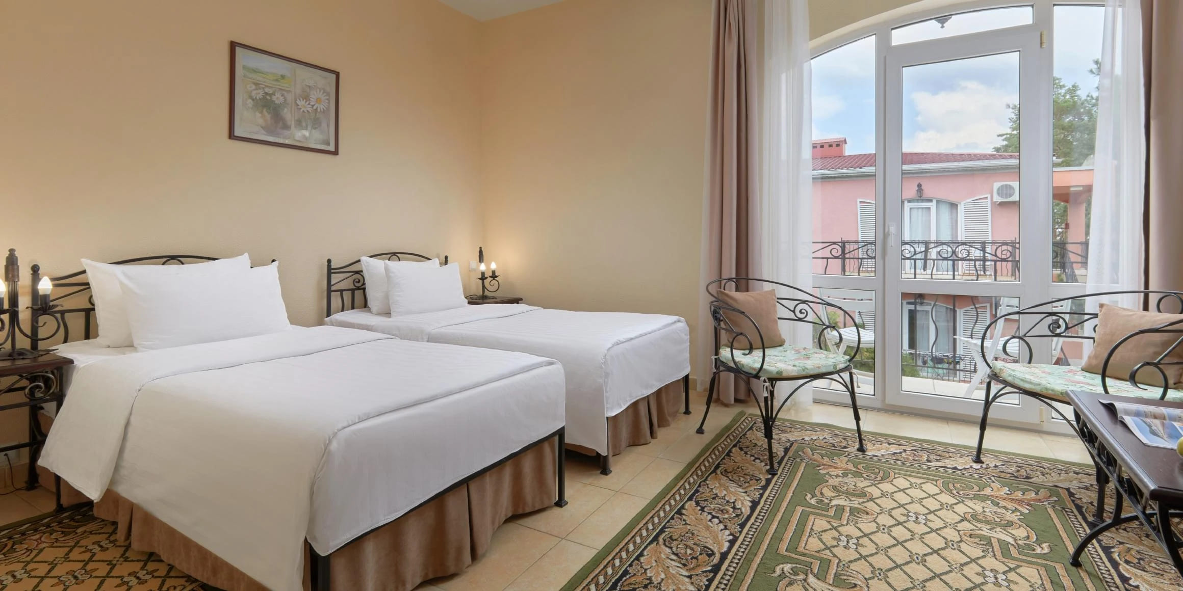 Стандарт 2-местный 1-комнатный 12-20 кв.м (1 доп. место). Балкон или дворик оборудован мебелью и сушилкой. Мебель: две односпальные кровати/одна двуспальная кровать, зеркало, прикроватные тумбочки, пуфик, стулья, туалетный столик, шкаф, мини-холодильник, сплит-система, телевизор, телефон. Санузел: с ванной, таз, тапочки, туалетные принадлежности: фен, халат.