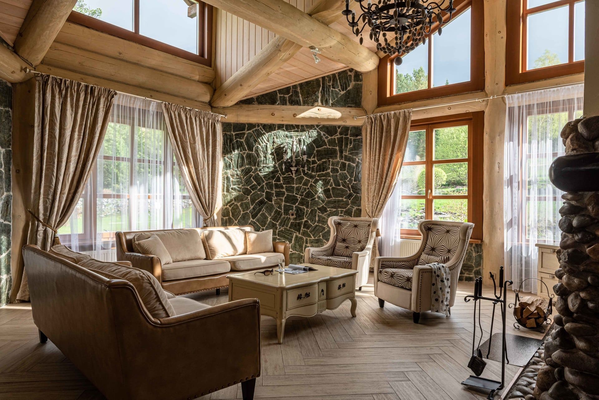 Все пространства оформлены в теплых тонах из эко-материалов, что дополнительно позволяет слиться с природой.