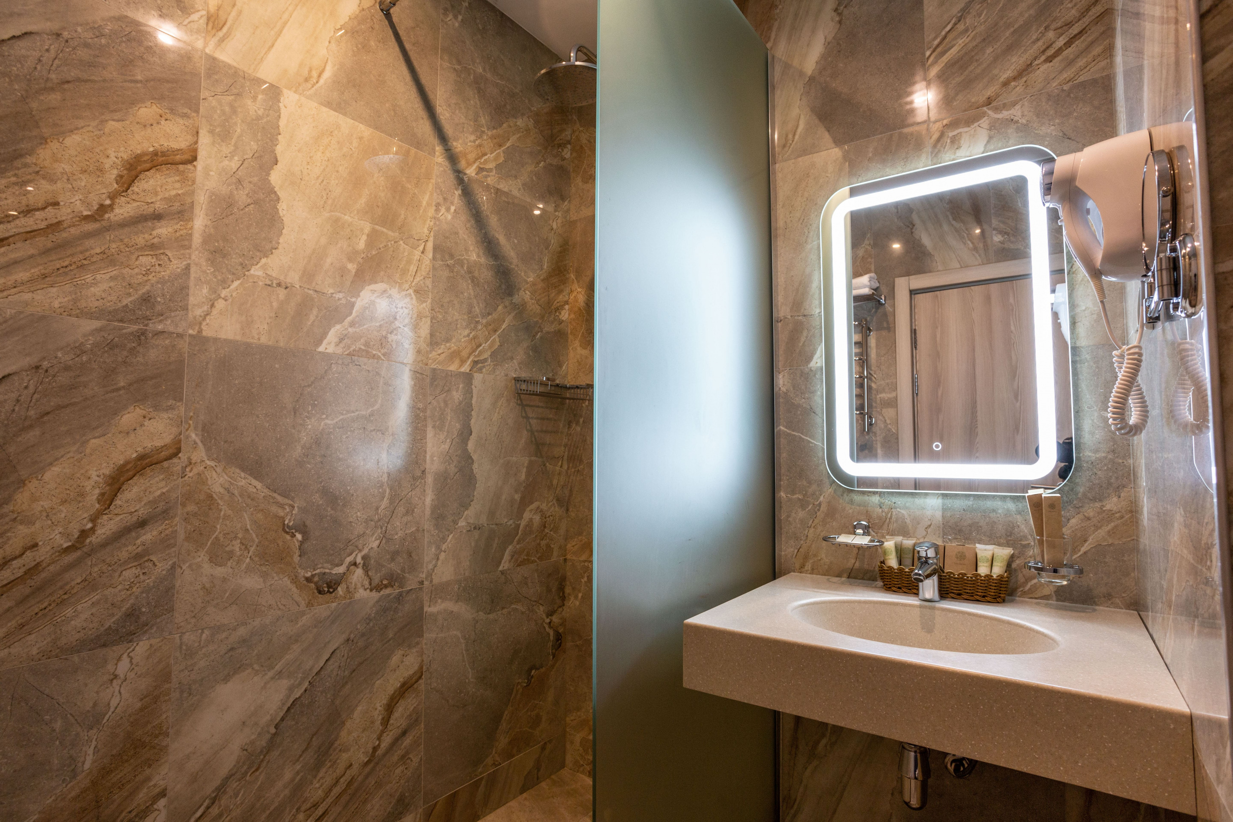 Интерконнект (48 кв.м.): Интерконнект – это два, объединенных межкомнатной дверью номера категории Delux, с двумя санузлами. Номера с панорамными окнами с видом на Кавказские горы или долину с двумя двухспальными кроватями размера кинг-сайз, с балконом и мебелью, зеркальным LED телевизором диагональю 32 дюйма, бесплатным Wi-Fi, чайной зоной для отдыха, письменным столом, эргономичной группой шкафов с зеркалом в пол, двумя комфортными санузлами с душем. Номер-интерконнект оформлен в стиле современного горного шале из натуральных материалов, с природными элементами декора и мягким ковровым покрытием. Отделка номера выполнена в теплых древесных тонах, с яркими акцентами золотистого текстиля и гобеленов.