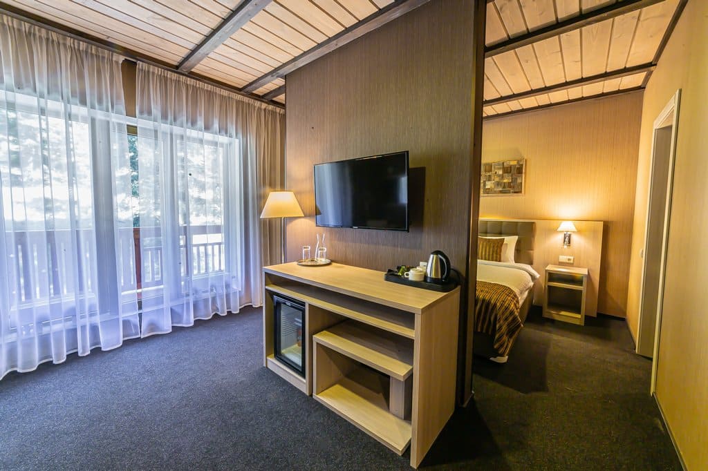 Deluxe KingSize (24 кв.м.): С панорамными окнами с видом на Кавказские горы или долину с одной двухспальной кроватью размера кинг-сайз, с балконом и мебелью, зеркальным LED телевизором диагональю 32 дюйма, бесплатным Wi-Fi, чайной зоной для отдыха, письменным столом, эргономичной группой шкафов с зеркалом в пол, комфортной ванной комнатой с душем. Номер оформлен в стиле современного горного шале из натуральных материалов, с природными элементами декора и мягким ковровым покрытием. Отделка номера выполнена в теплых древесных тонах, с яркими акцентами золотистого текстиля и гобеленов.