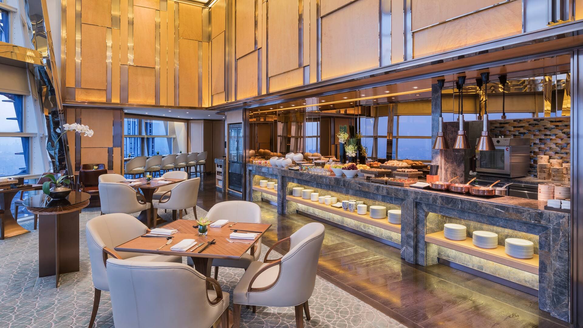 Diplomatic suite (110 кв. м). Гостиная с обеденной зоной, кухня, спальня с кроватью king-size, гардеробная, ванная комната с джакузи и отдельной душевой кабиной. Дополнительно: телевизор в ванной комнате, кофеварка. Вид на небоскребы района Pudong. Гости данных номеров имеют особые привилегии.
