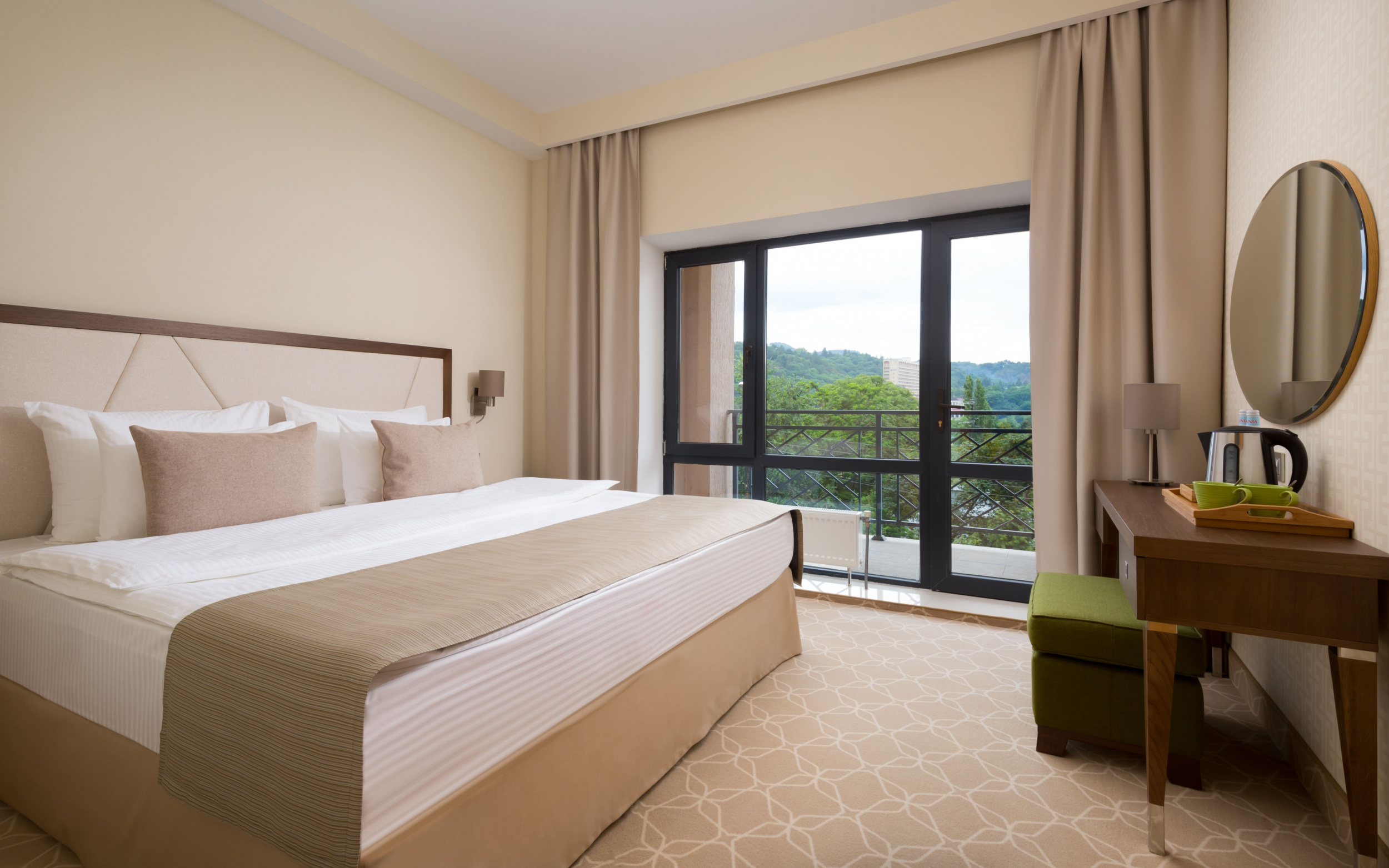 Люкс (54 кв. м). Номер с раздельными спальней и гостиной. Спальня с одной кроватью king size. Двухспальная кровать, телефон, сейф, мини бар, чайный набор, высокоскоростной бесплатный WI-FI, интерактивное TV, индивидуальная система климат контроля. В ванной комнате предоставляется набор полотенец, косметических принадлежностей, фен, банные халаты и тапочки. Кухня-гостиная: LCD телевизор с экраном 44 дюйма, обеденный стол, 4 стула, большой диван раскладывающийся в кровать (дополнительное спальное место), кухонный гарнитур, кухонная посуда, холодильник, электрический чайник, варочная панель, посудомоечная машина, гладильная доска, утюг.