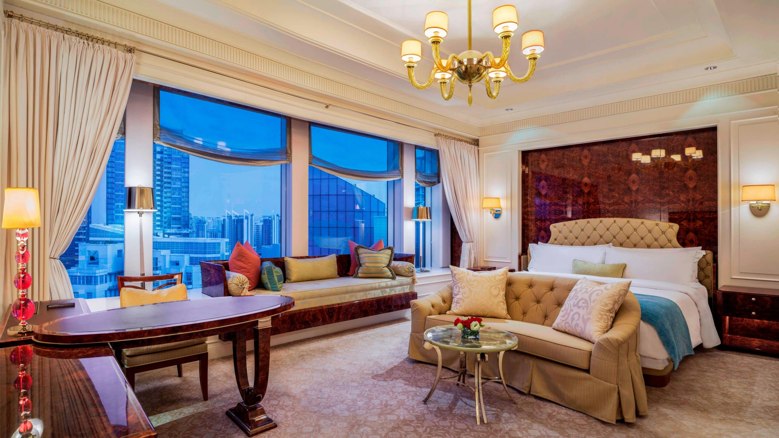 King Cole suite (190 кв. м). Терраса, прихожая, гостиная, спальня с кроватью king-size, гардеробная, ванная комната с ванной, гостевой туалет. Расположен в угловой части здания на 20 этаже. Вид на город.