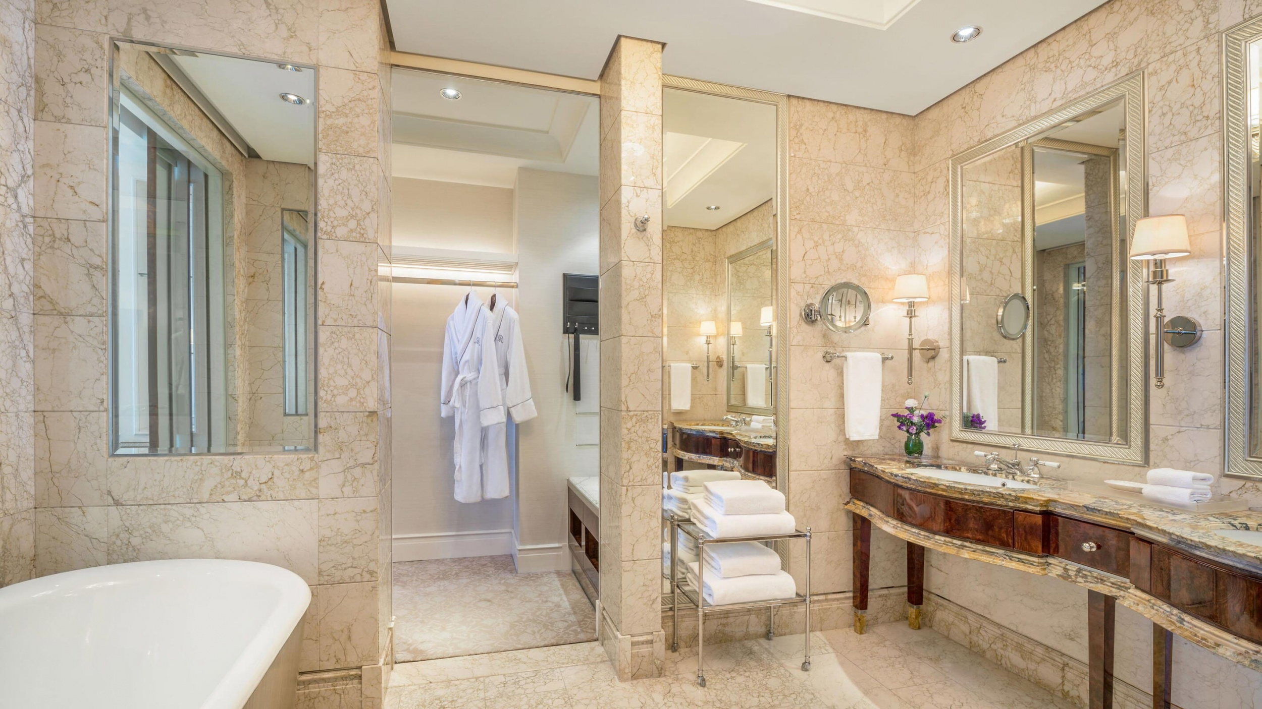 Carolina Astor suite (80-90 кв. м). Гостиная, спальня с кроватью king-size, гардеробная, ванная комната с ванной и душевой кабиной с функцией гидромассажа.