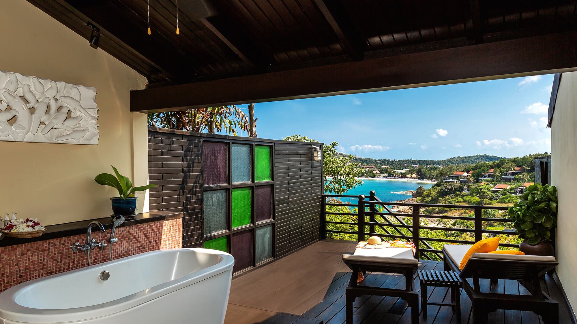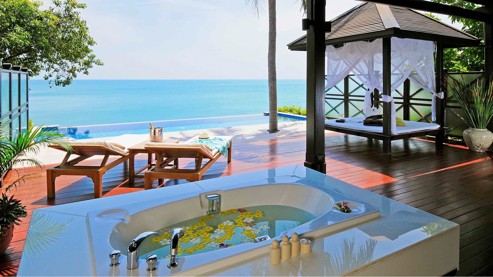 Tongsai pool villa (180 кв. м): терраса с открытым персональным бассейном, ванной и обеденной зоной на открытом воздухе, спальня с гостиной зоной, ванная комната. Частичный вид на море и вид на сады.