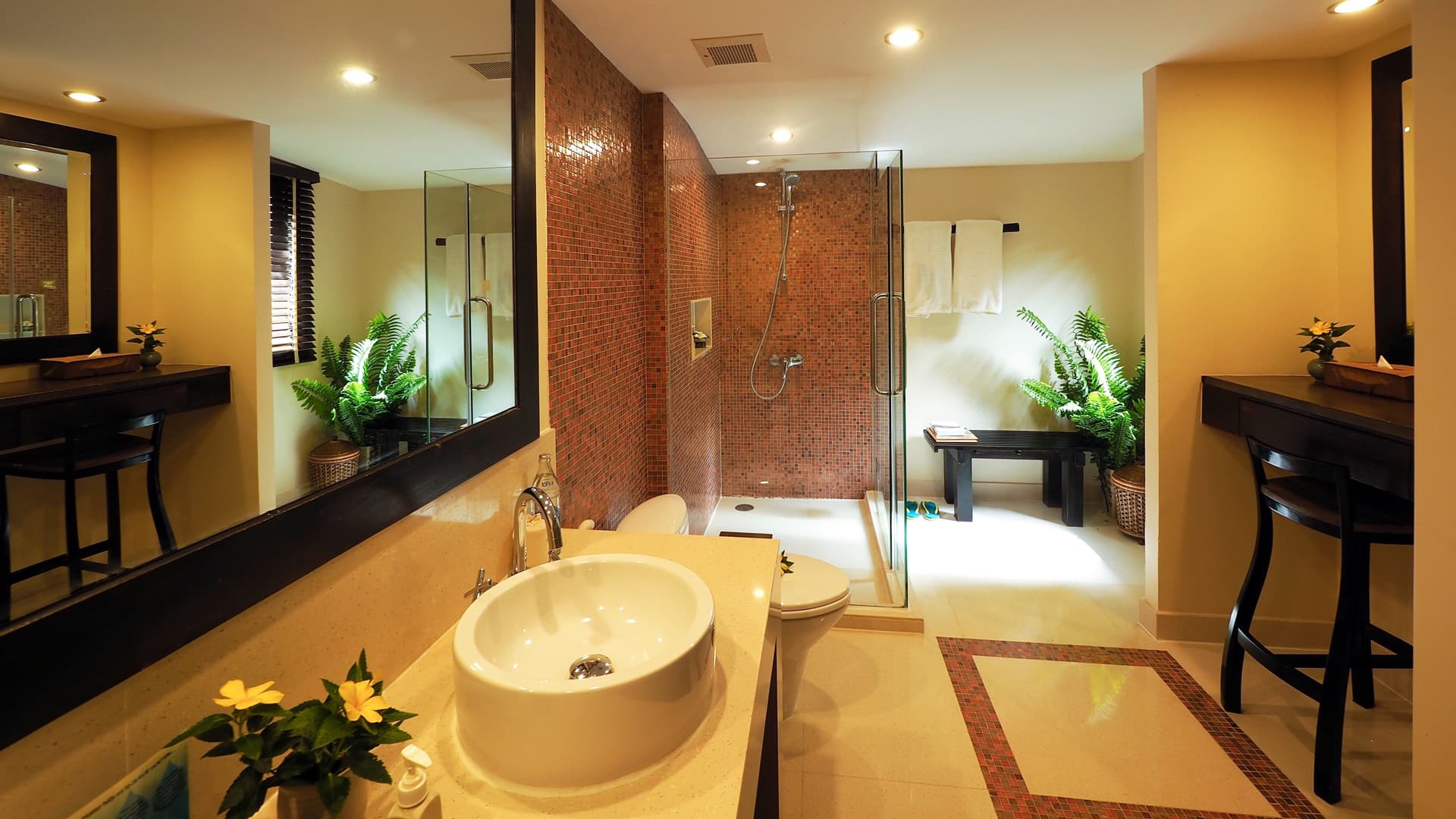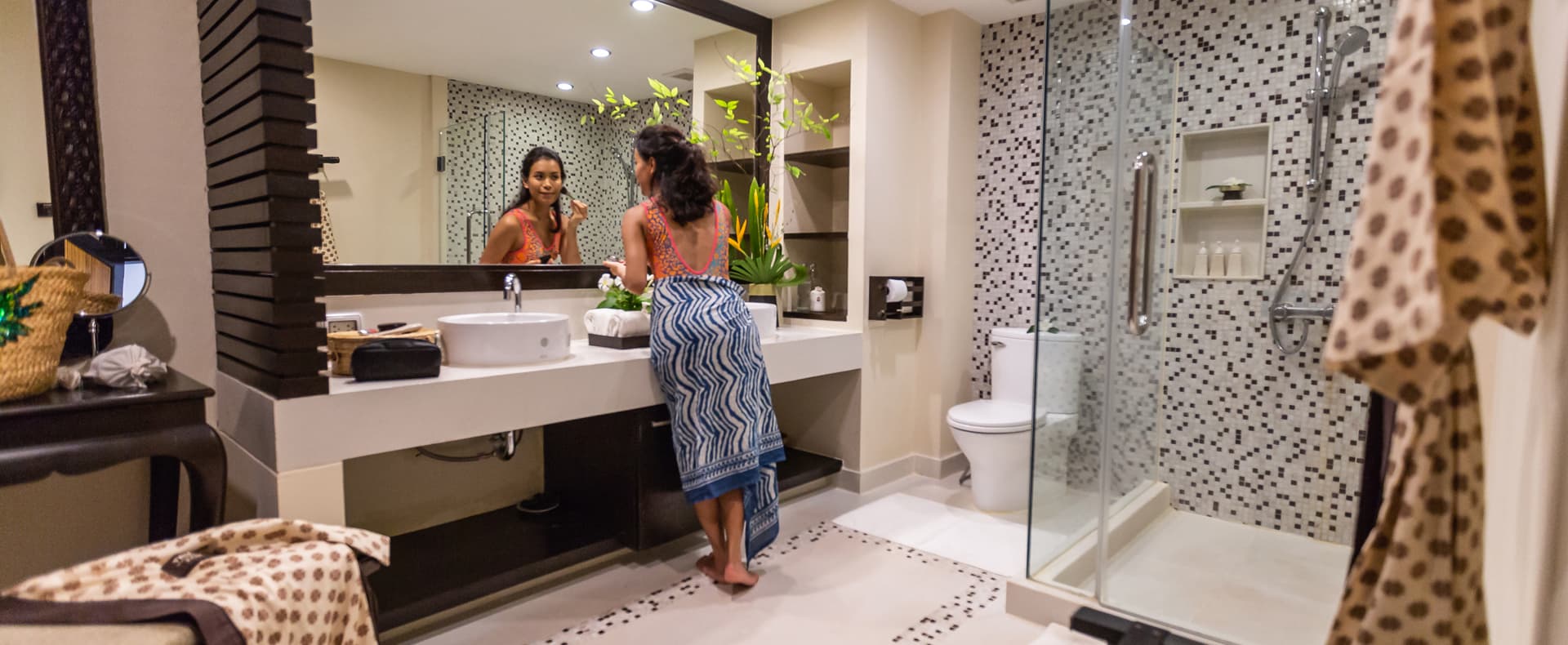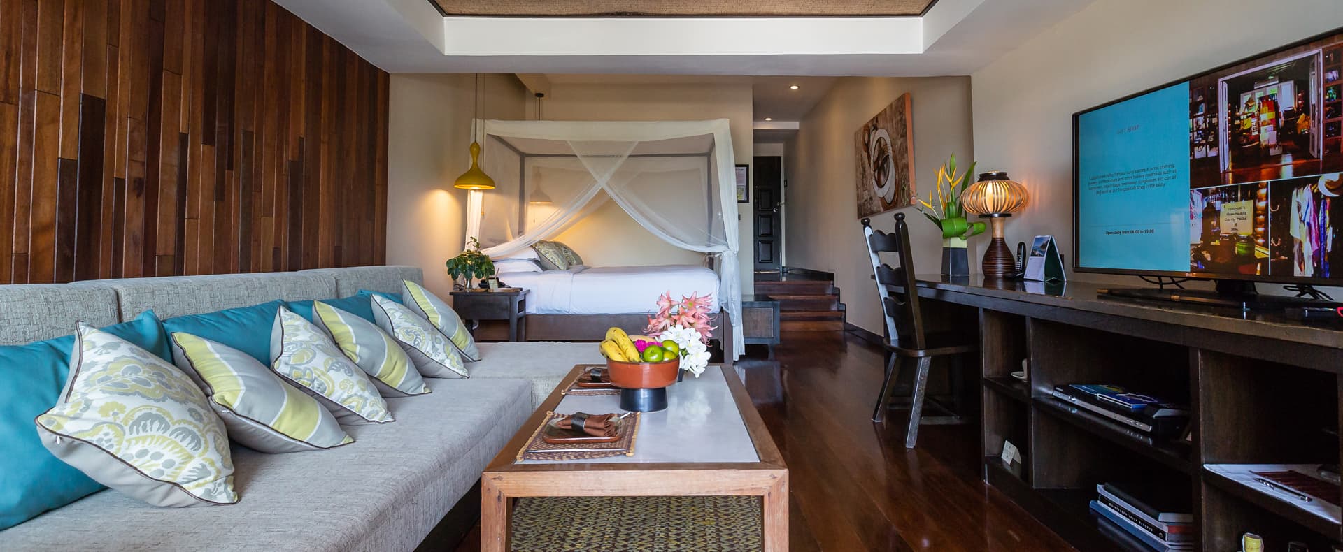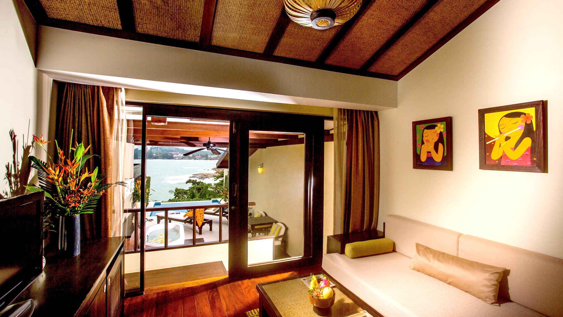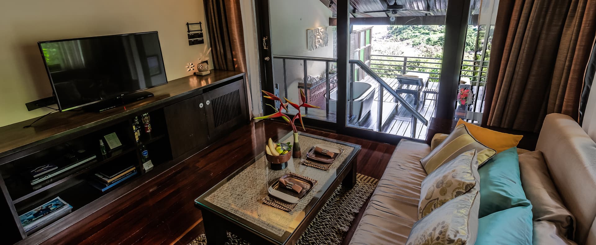 Cottage suite (68-78 кв. м): двухуровневый номер. Терраса с ванной на открытом воздухе, спальня с гостиной зоной, ванная комната с душевой кабиной. Расположены на холме. Вид на море.