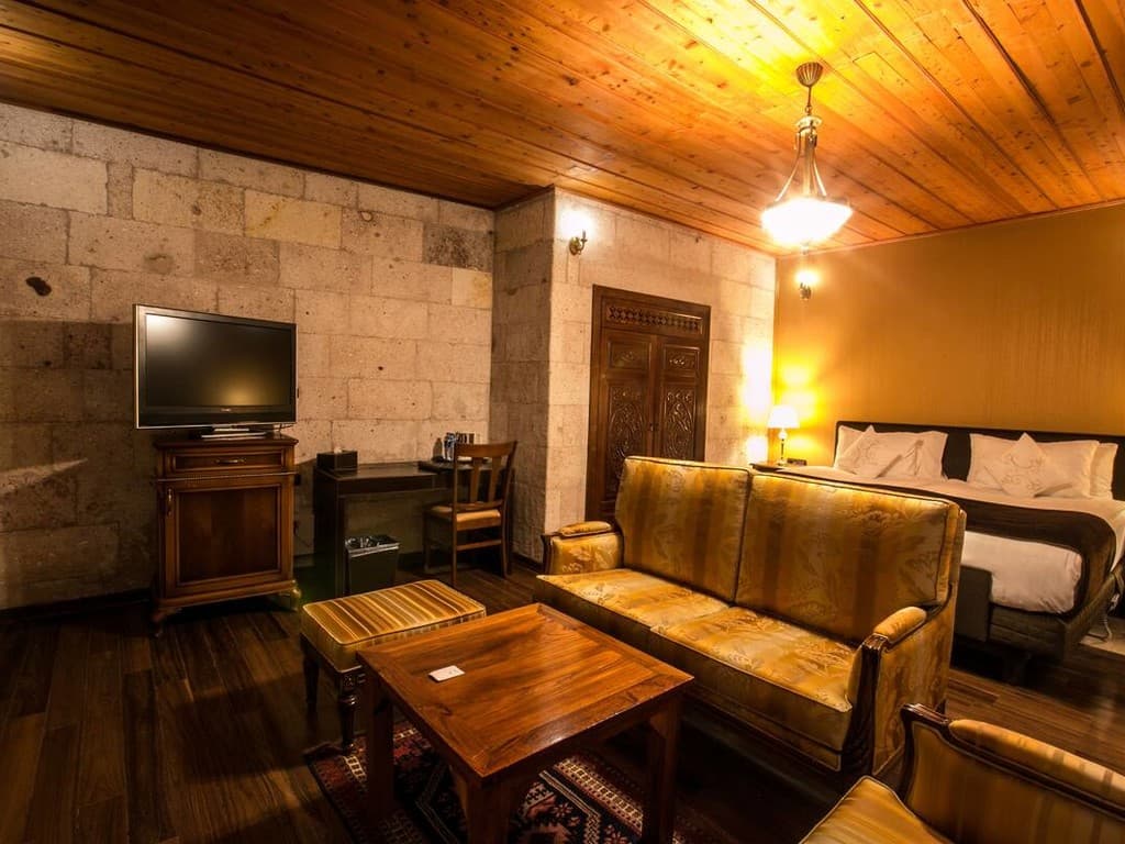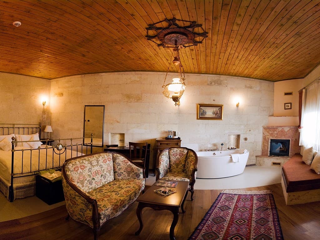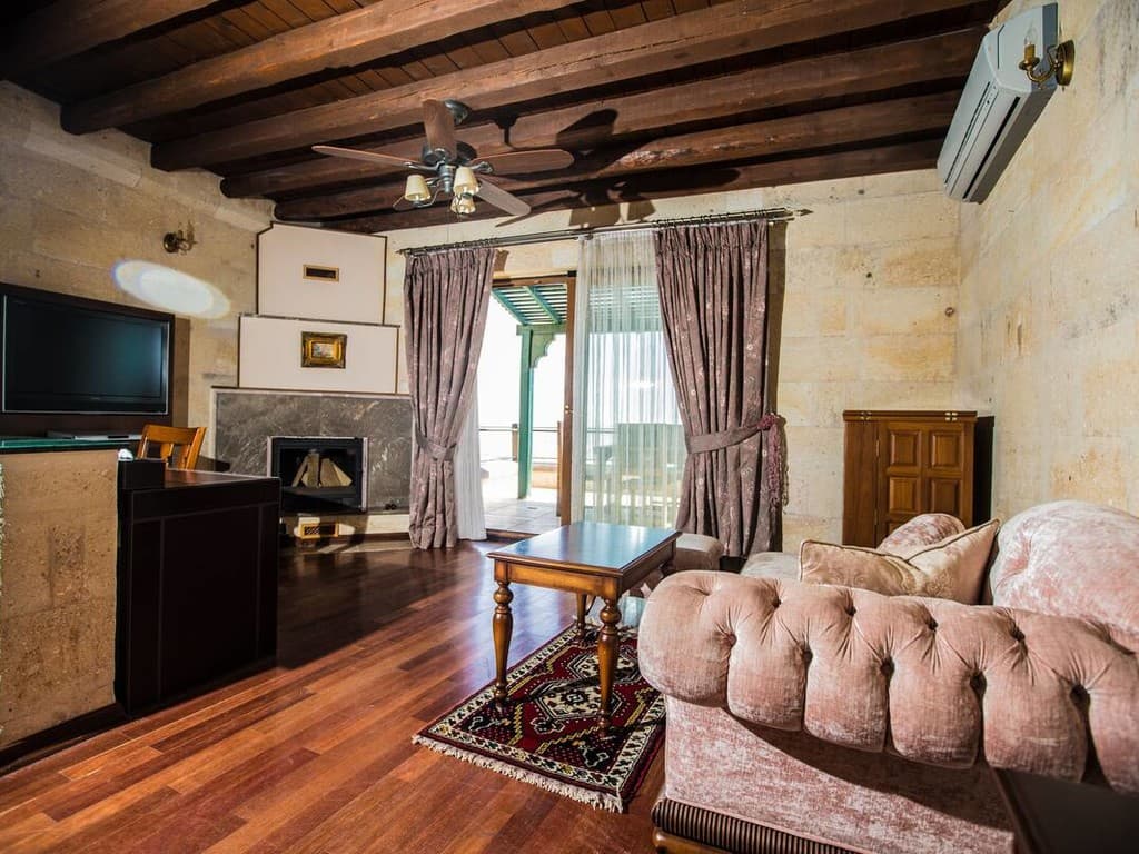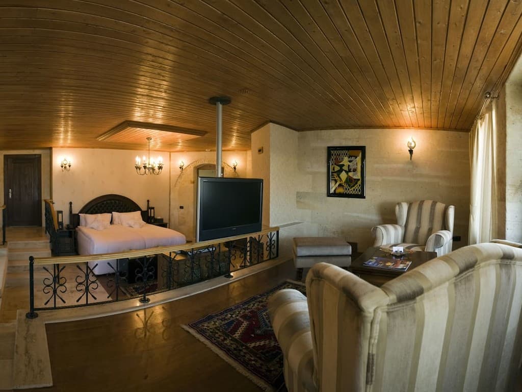 Padishah suite: балкон или патио, спальня с гостиной зоной и ванной (кровать king-size), ванная комната с джакузи и гидромассажным душем. Вид на Каппадокию.