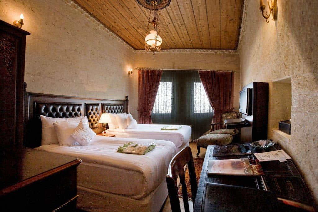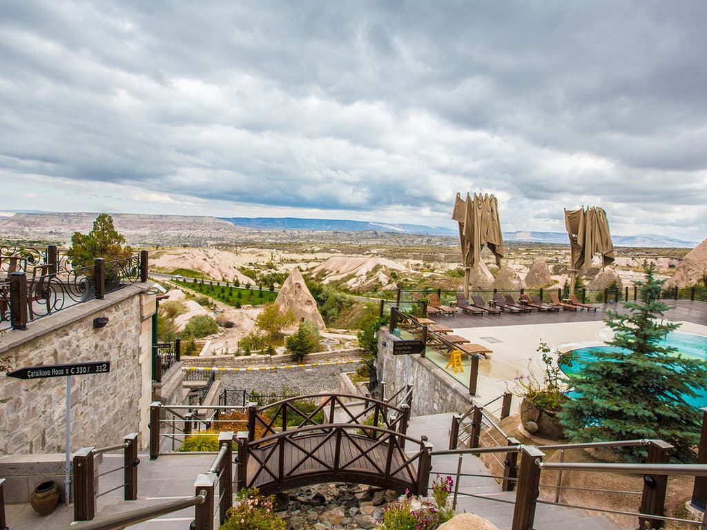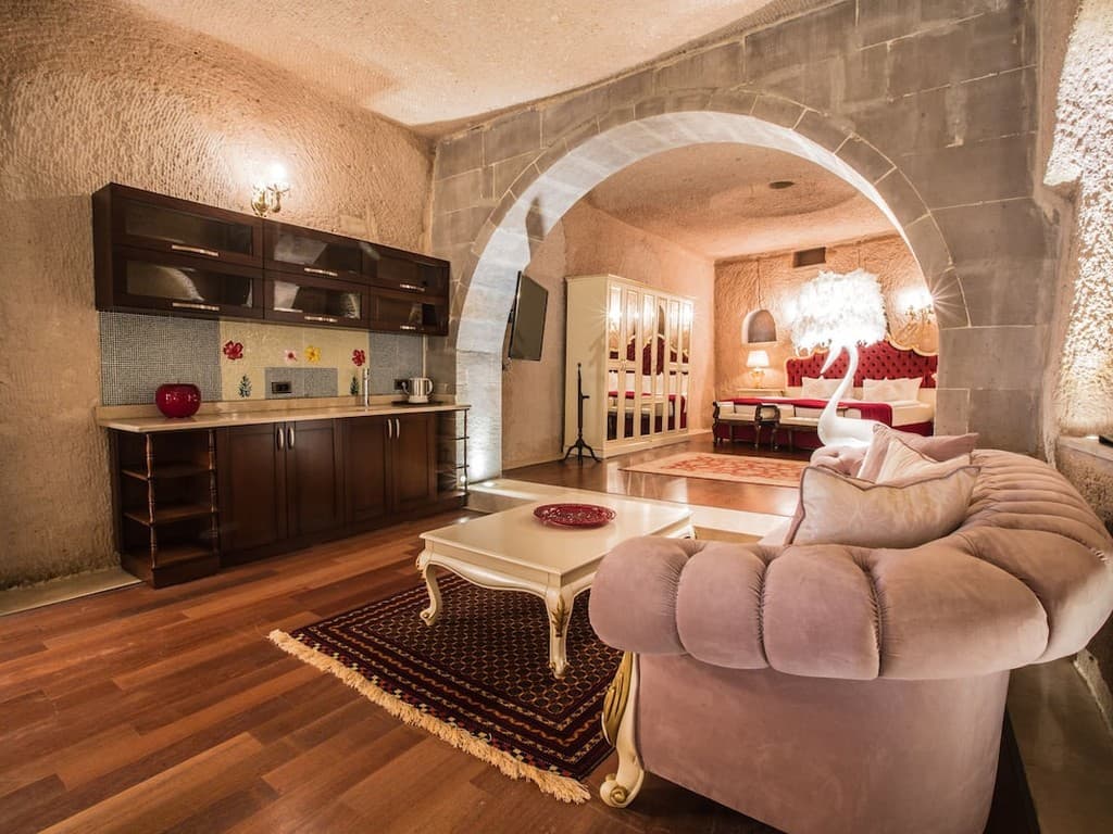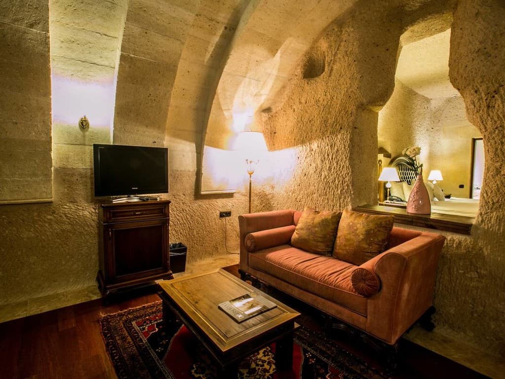 Padishah suite: балкон или патио, спальня с гостиной зоной и ванной (кровать king-size), ванная комната с джакузи и гидромассажным душем. Вид на Каппадокию.