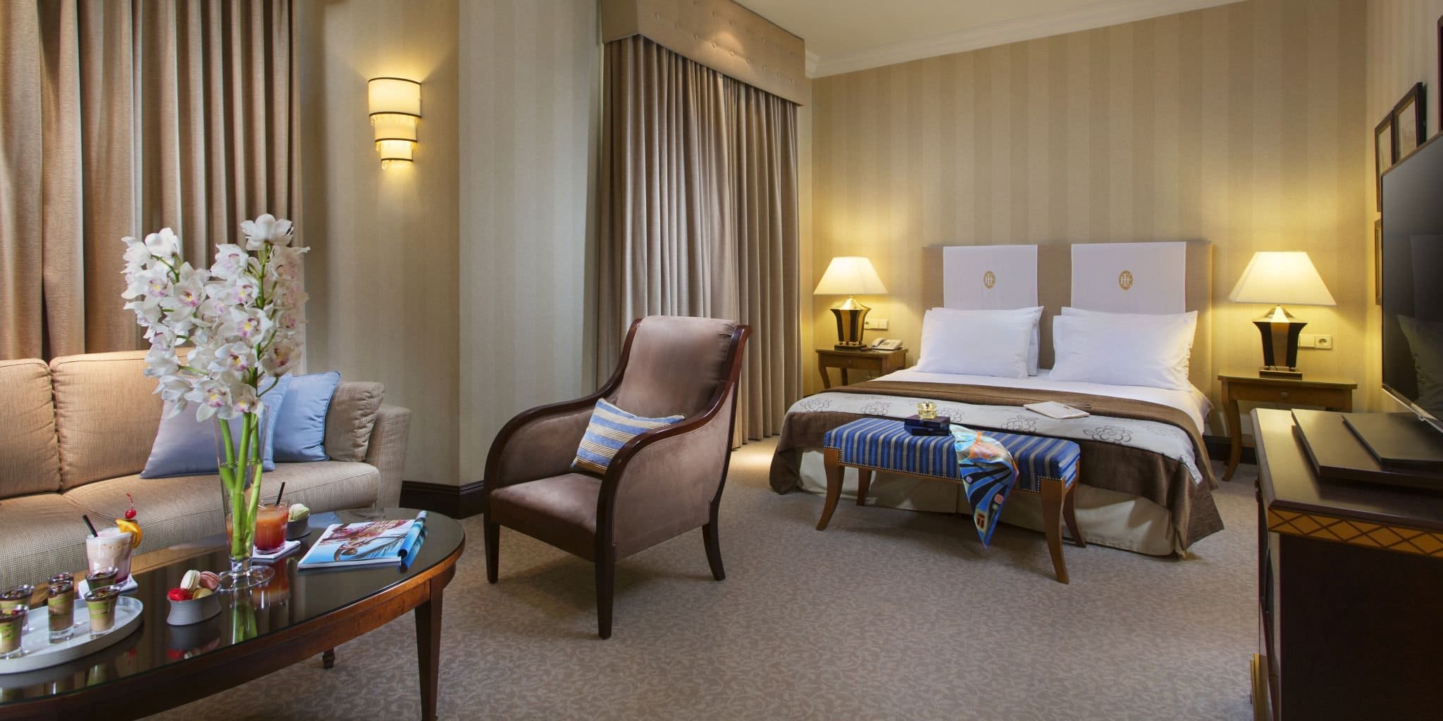 В оформленных в стиле ар-нуво номерах подключено спутниковое телевидение, установлен мини-бар и обустроена отделанная мрамором ванная комната с ванной и душем, а также бесплатной косметикой L'Occitane.